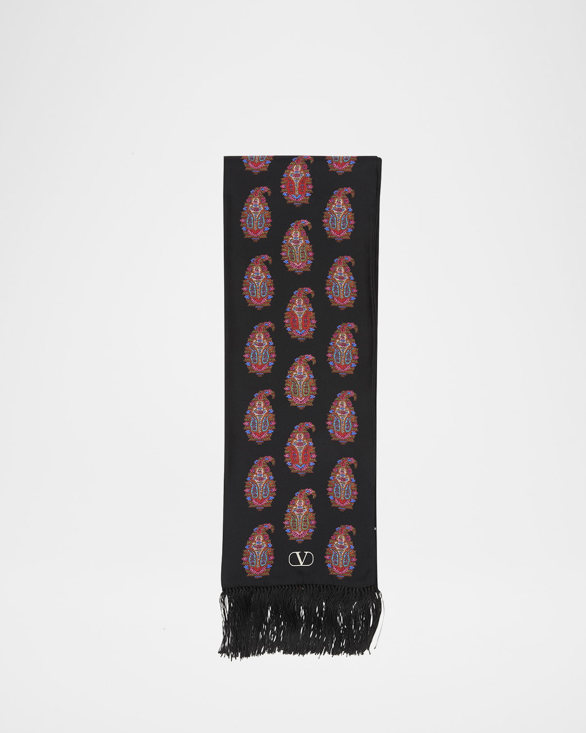 - Valentino twill scarf in a paisley intarsia - Approx. 70.8"L x 6.7"W - Can be styled in multiple ways - V Logo on the corner - Fringe ends - Silk - Made in Italy - Silk/viscose - Made in Italy