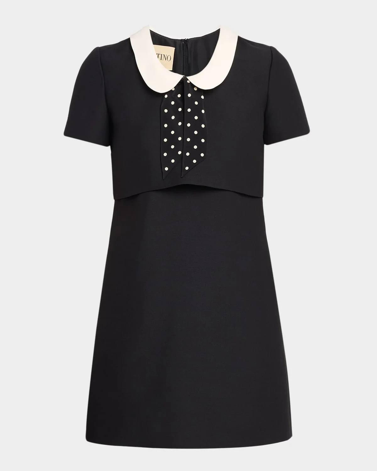 Valentino Garavani dress is crafted from wool crepe accented with a contrast collar, a polka-dot silk neck tie, and a tiered bust detail Peter Pan collar; button back Short sleeves Sheath silhouette Mini length Invisible back zip Virgin wool/silk Made in Italy