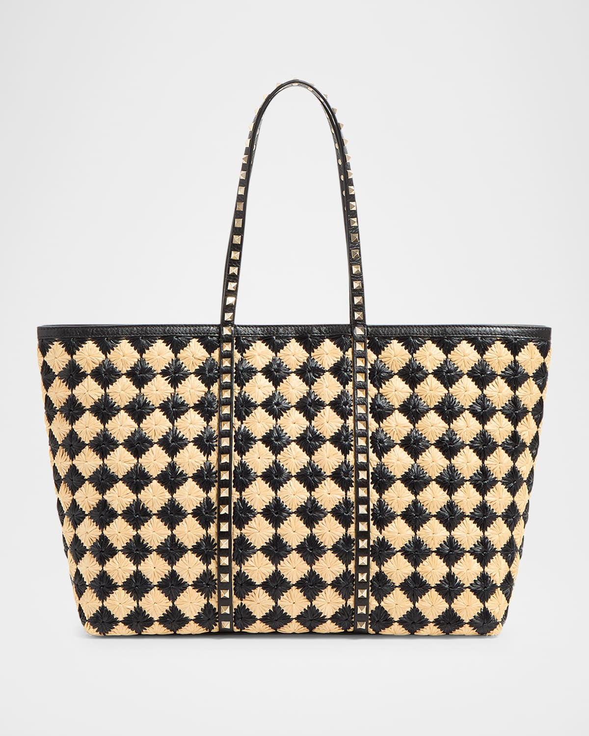 - Valentino Garavani shopping bag showcases synthetic raffia check embroidery - Dual top handles; 8" drop - Exterior, platinum-finish studs and hardware - Interior, removable leather pouch - Magnetic top closure - Protective feet - Canvas lining - Approx. 16.6"W x 10.6"H x 4.7"D - Made in Italy