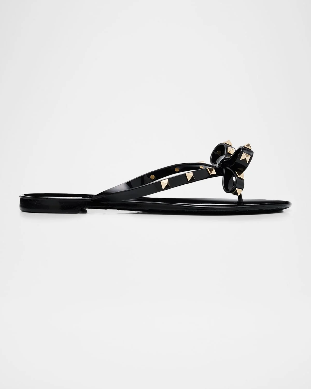 Valentino Garavani jelly PVC sandals with signature pyramid Rockstuds Flat heel Bow detail at thong strap Stamped sole for traction Slide style Made in Italy