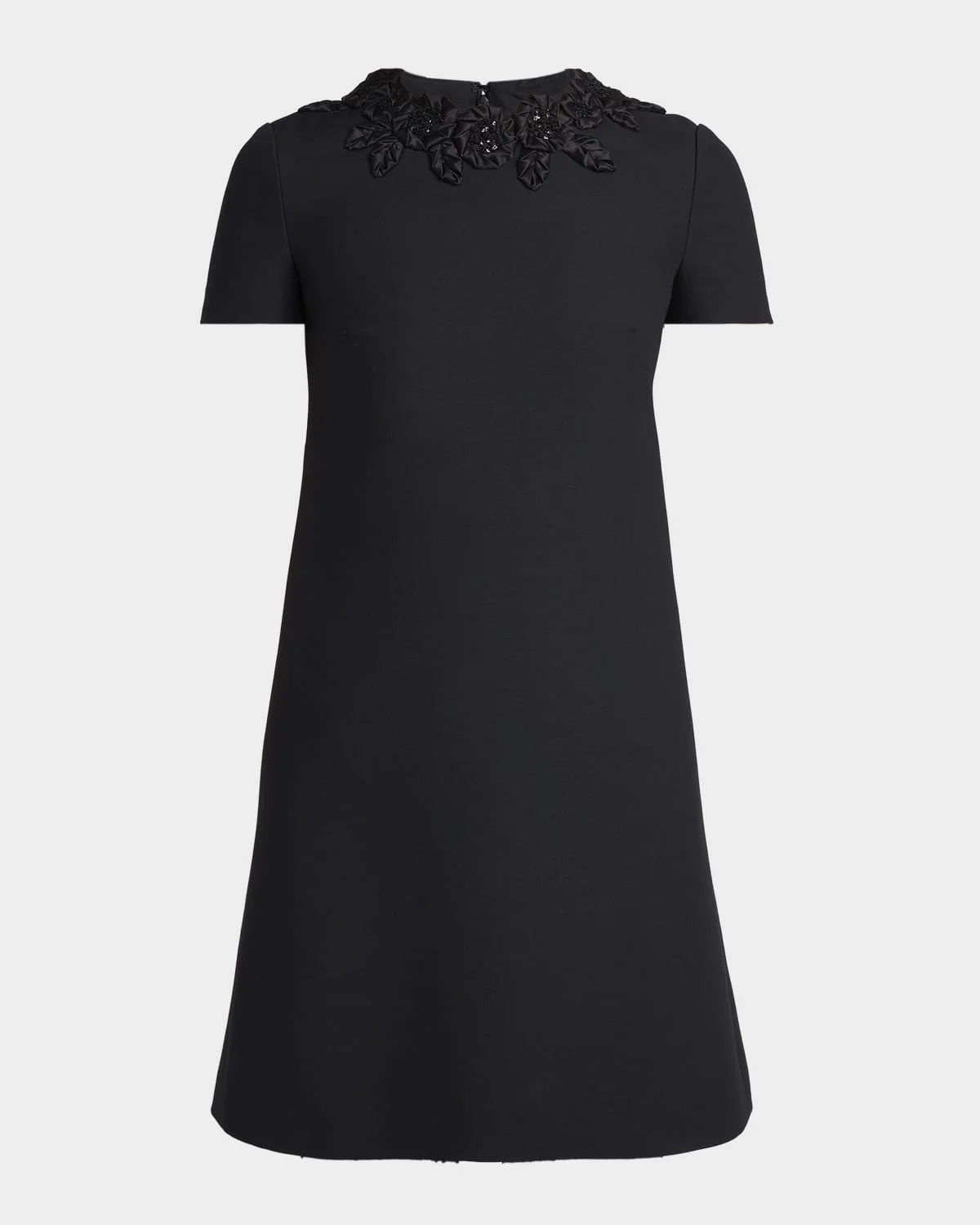 Valentino Garavani dress is crafted of wool crepe adorned with a silk ribbon rose embroidery along the collar Round neckline Short sleeves Aline silhouette Mini length Invisible back zip Virgin wool/silk Made in Italy