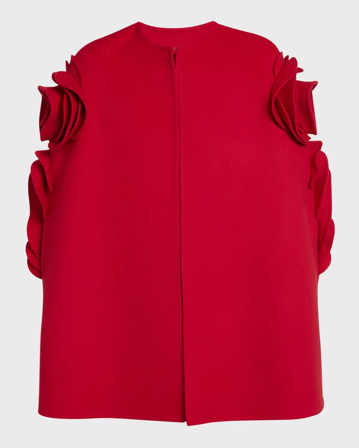 Valentino Garavani woolcashmere cape featuring 3D rose applique Round neckline Short sleeves; slit Relaxed fit Hem falls to the hip Front hook closure Leather lining and sole Virgin wool/cashmere Made in Italy