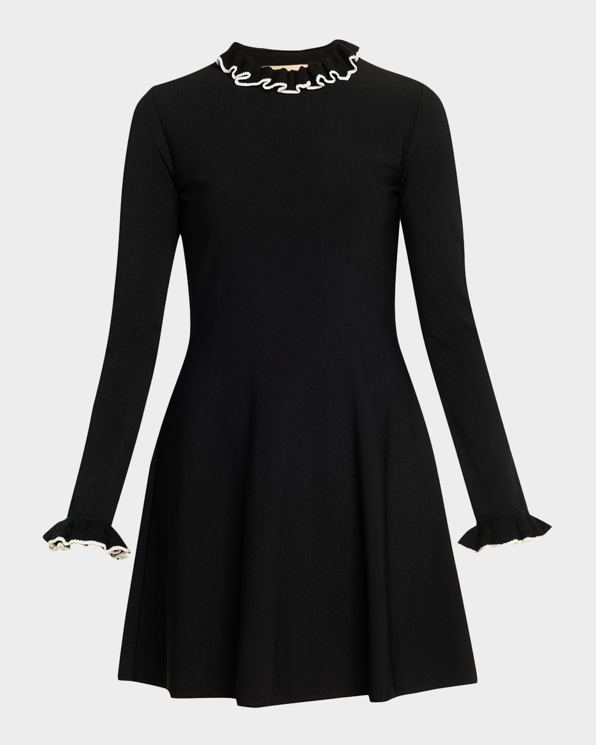 Valentino Garavani mini sweater dress with ribbed contrasttipped ruffles Jewel neckline Long sleeves Hem falls above the knee Aline silhouette Viscose/polyester Made in Italy
