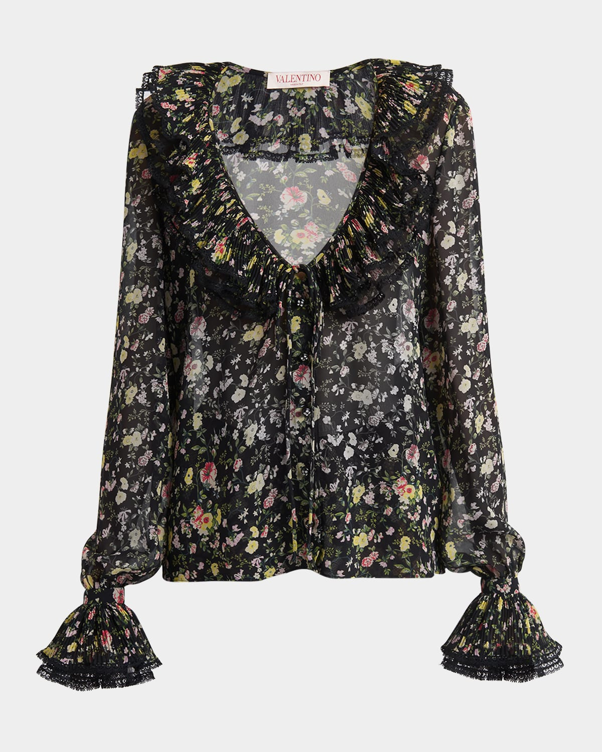Valentino Garavani semisheer blouse in flower print with ruffle trim V neckline; button front Long sleeves; bell cuffs Relaxed fit Silk Made in Italy