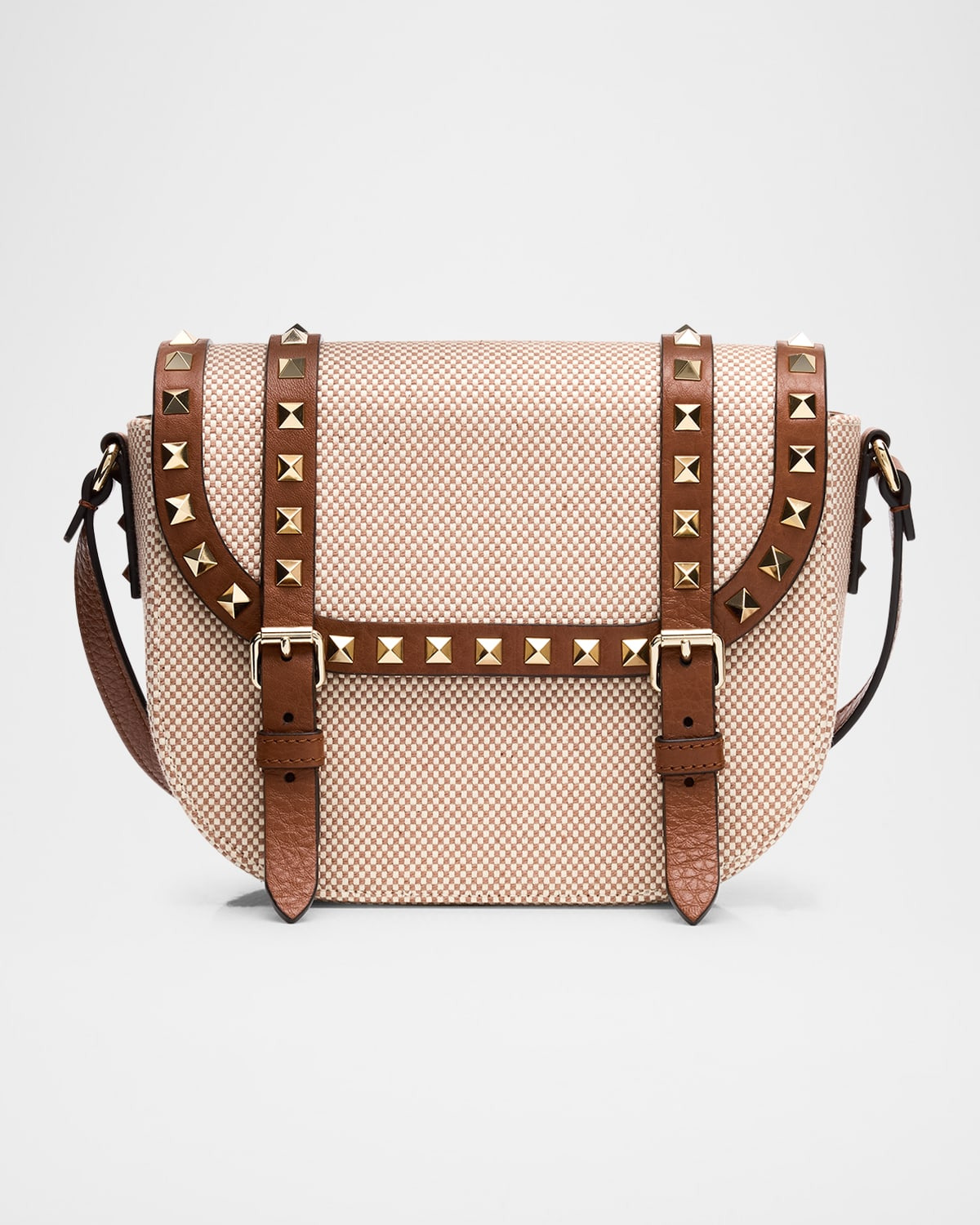 - Valentino Garavani woven canvas and leather saddle crossbody bag with signature Rockstuds - Adjustable crossbody strap - Flap top with buckle magnetic closures - Exterior, back slip pocket - Interior, one zip pocket and two card slots - Approx. 5.9"H x 7.7"W x 2.2"D - Cotton - Made in Italy