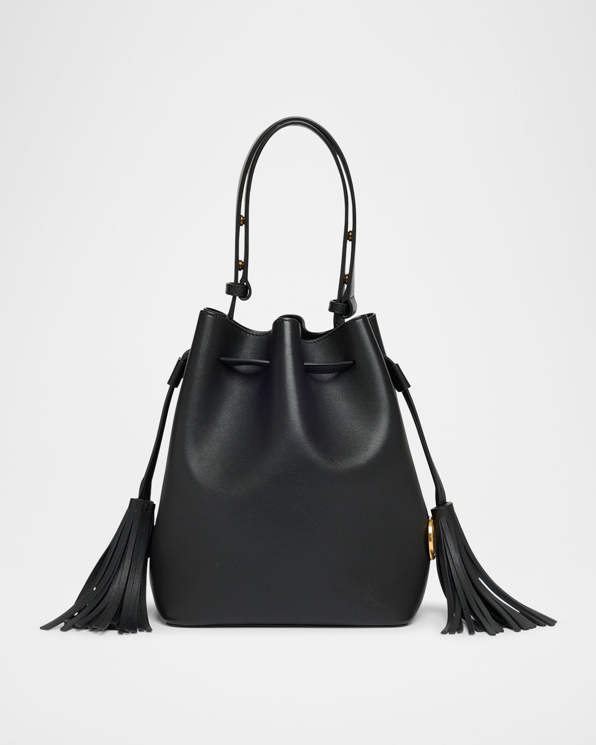 - Valentino Garavani "So Seau" leather bucket bag with tassel straps - Features signature VLOGO accent - Adjustable shoulder strap - Drawstring closure - Brass hardware - Approx. 10.8"H x 8.3"W x 5.5"D - Made in Italy
