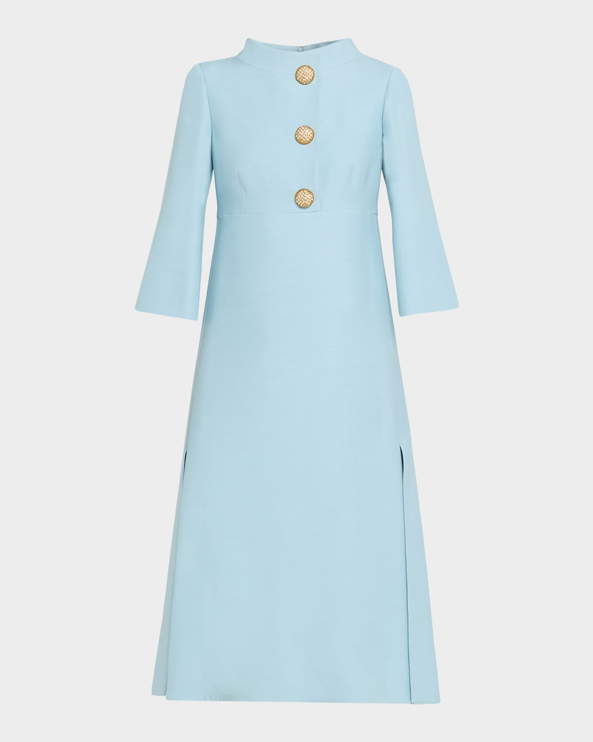 - Valentino Garavani crepe couture dress featuring strass buttons and a back pleat detail - High neckline - 3/4 sleeves - Empire waist seam - Knee length - A-line silhouette - Back zip - Virgin wool/silk - Lining: Silk - Made in Italy