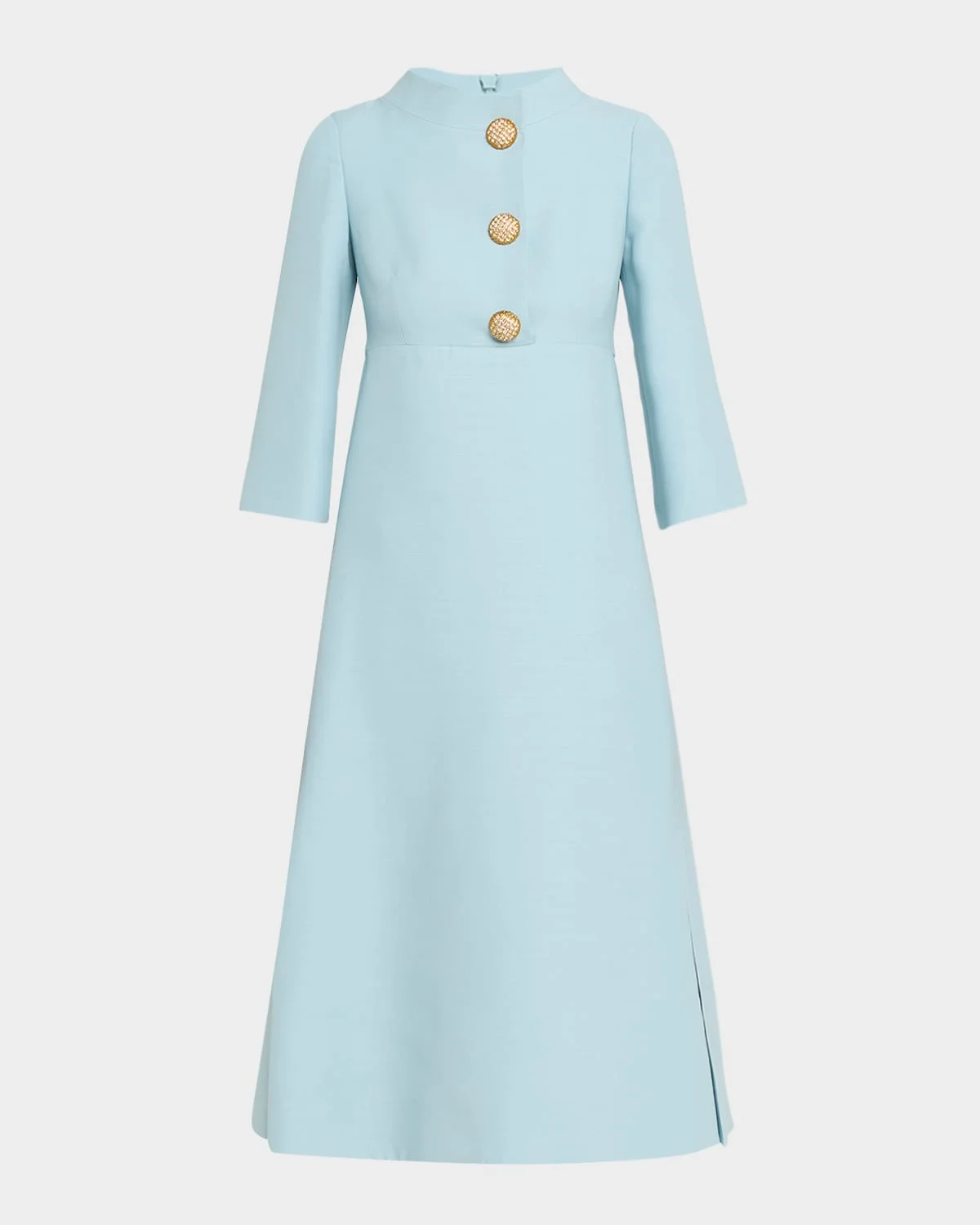 Valentino Garavani crepe couture dress featuring strass buttons and a back pleat detail High neckline 3/4 sleeves Empire waist seam Knee length Aline silhouette Back zip Virgin wool/silk Lining: Silk Made in Italy