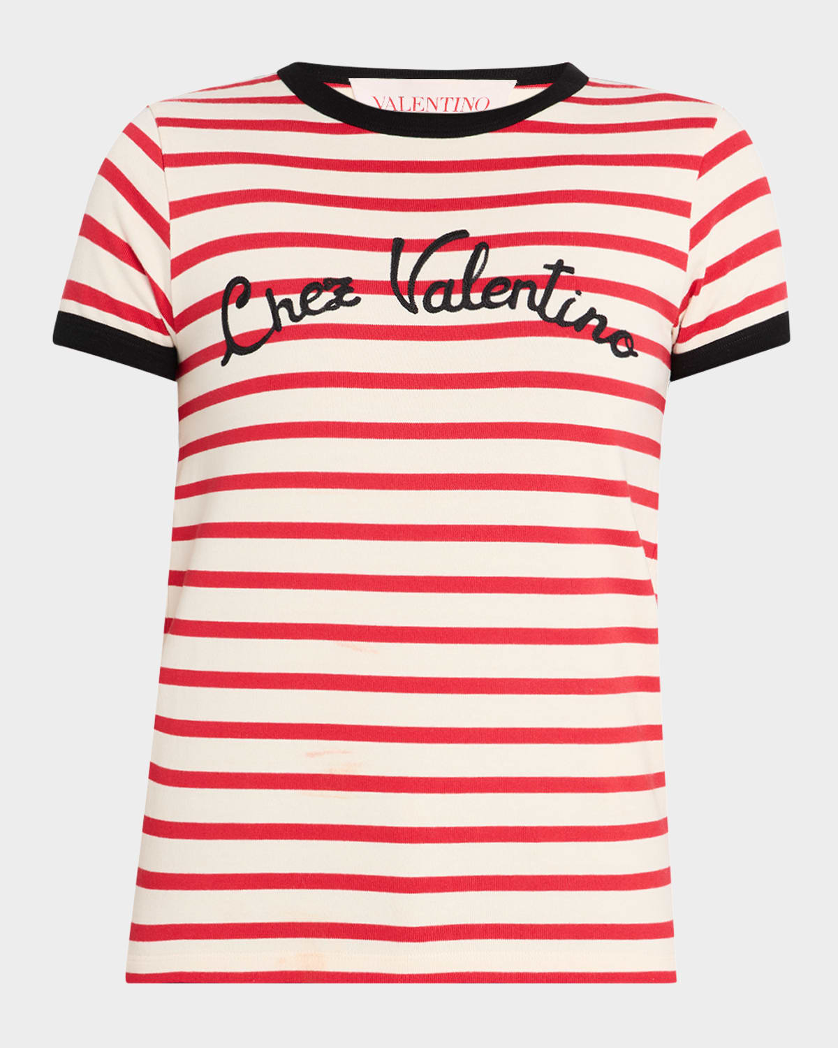 Valentino Garavani striped cotton jersey Tshirt featuring script embroidered chest and contrast trim Crew neckline Short sleeves Slim fit Pullover style Cotton Made in Italy