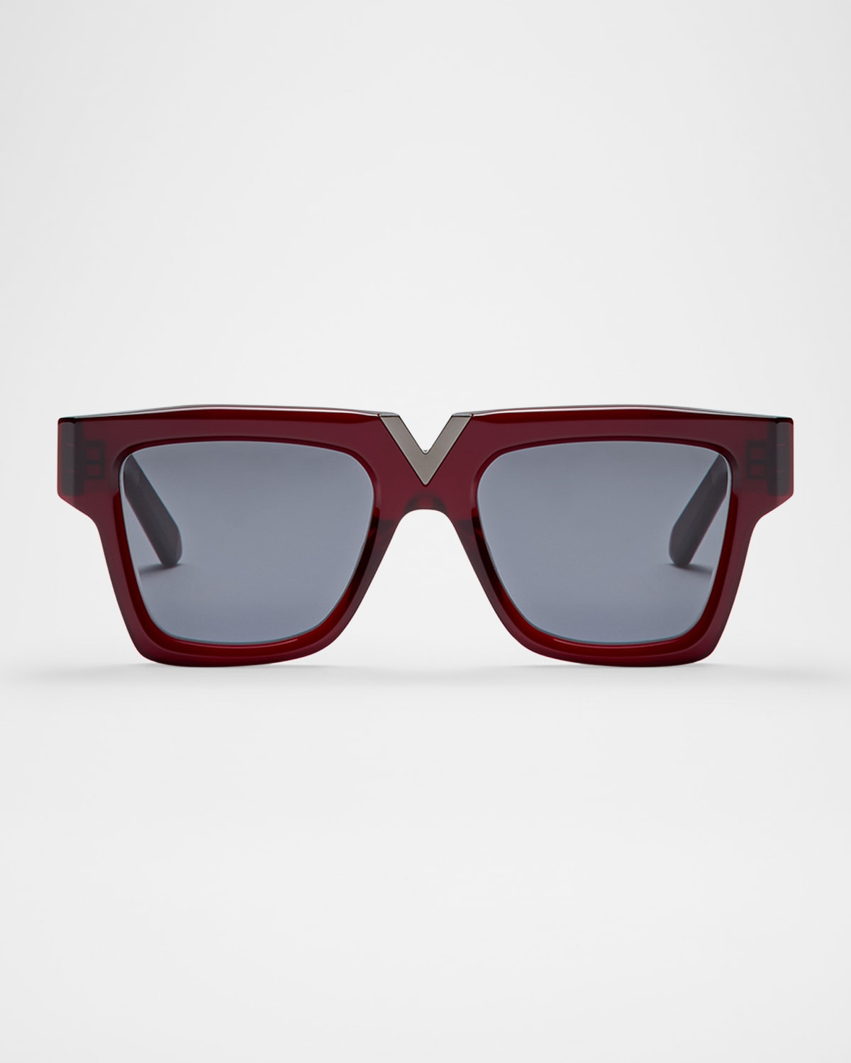 - Valentino Garavani "V-Gold I" square sunglasses in acetate - Lens/bridge/temple (in mm): 51-19-145 - Solid lenses - V-logo nose bridge accent - Saddle nose bridge - Logo script on temples - Thin, tapered arms - 100% UVA/UVB protection - Made in Japan - Proposition 65 warning for California residents