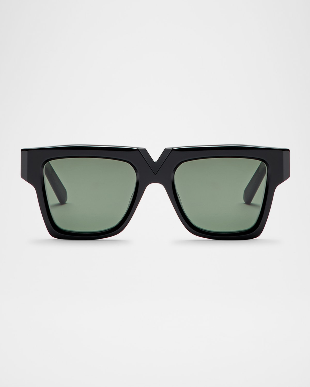 - Valentino Garavani "V-Gold I" square sunglasses in acetate - Lens/bridge/temple (in mm): 51-19-145 - Solid lenses - V-logo nose bridge accent - Saddle nose bridge - Logo script on temples - Thin, tapered arms - 100% UVA/UVB protection - Made in Japan - Proposition 65 warning for California residents
