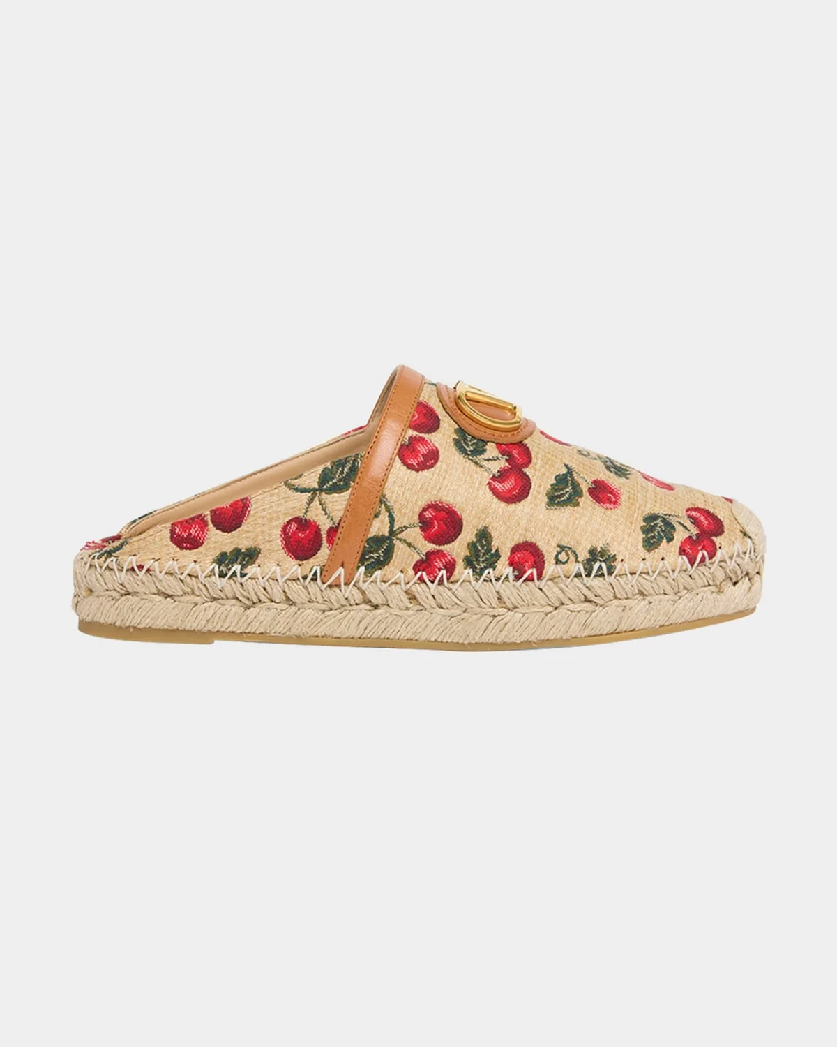 Valentino Garavani cherryprint cotton and raffia espadrille mules with leather trim and a golden V logo medallion. Flat braided jute heel. Round toe. Slide style. Leather lining. Leather sole. Made in Italy.