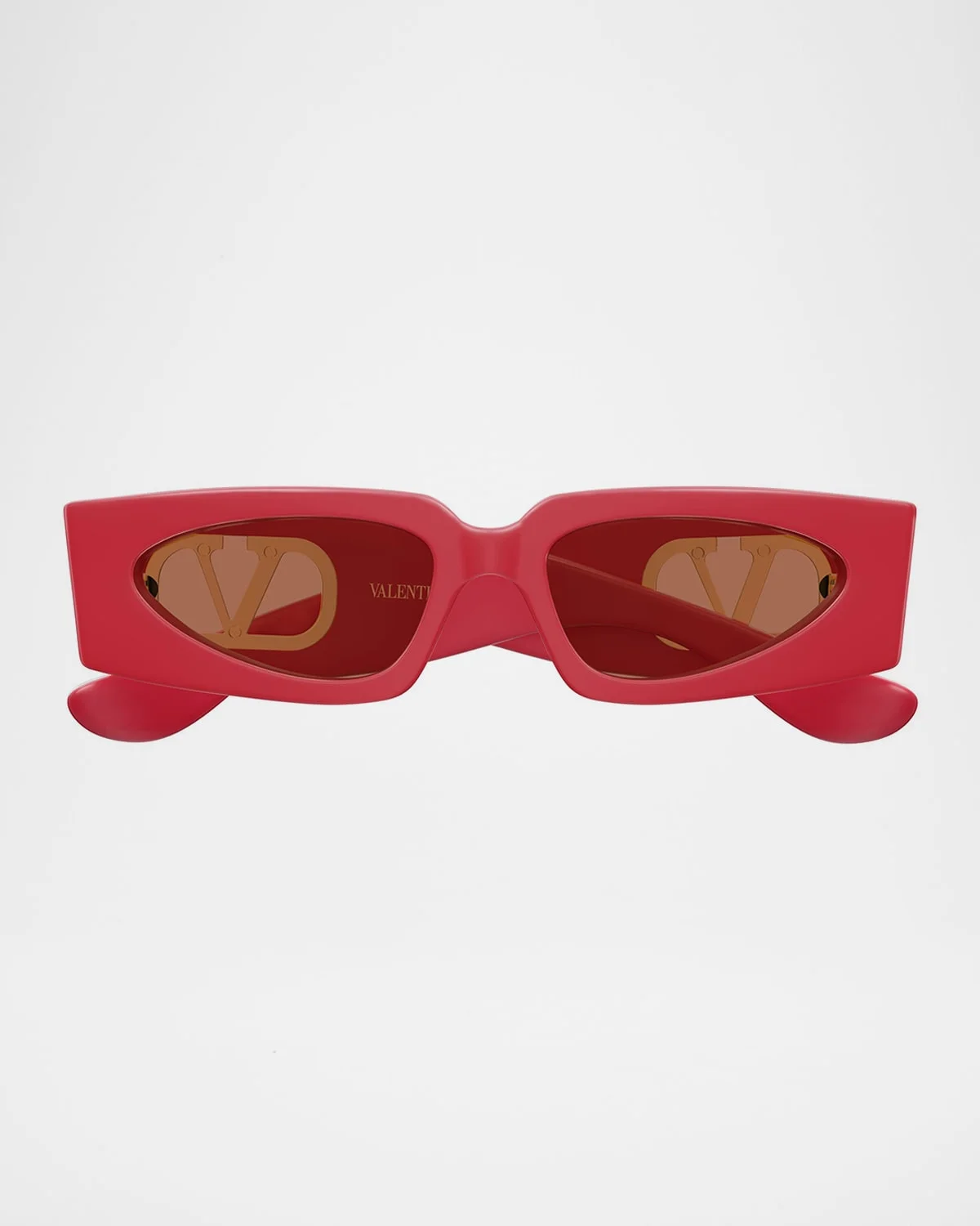 Crafted from chunky acetate in the house & apos;s iconic hue, these Valentino Garavani "VG0001S" sunglasses feature a bold cat-eye shape enhanced with VLogo Signature cutout temples. Eye/bridge/temple (in mm): 53-17-140 Monochromatic bio nylon lenses Saddle nose bridge Wide, tapered arms Cutout VLogo Signature & nbsp; Acetate 100% UVA/UVB protection Made in Japan