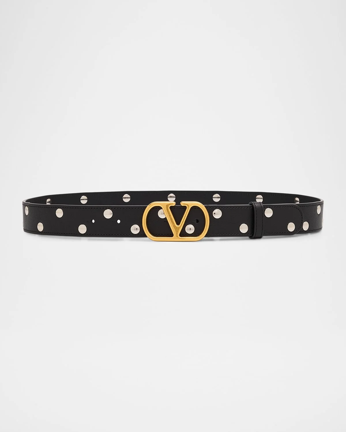 Valentino Garavani shiny calfskin leather belt studded with metal rivets for a contrasting finish Approx. 1.2"H VLogo Signature buckle in antique brass Buckle closure Leather Made in Italy