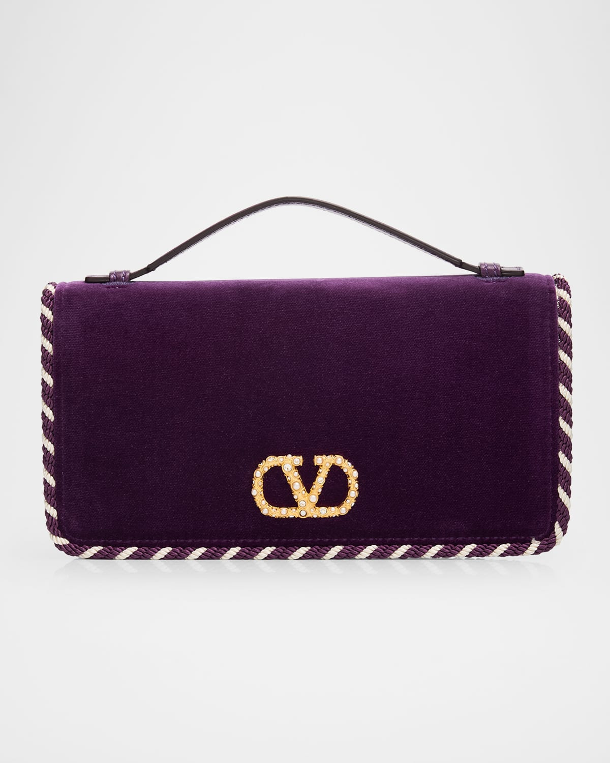 Valentino Garavani wallet in suede and fabric Feature signature embellished VLOGO accent Top handle Detachable chain crossbody strap Can be worn as a wallet clutch, top handle, or crossbody bag Flap top with magnetic closure Interior, one zip pocket, two card slots Approx. 4.3"H x 7.5"W Made in Italy