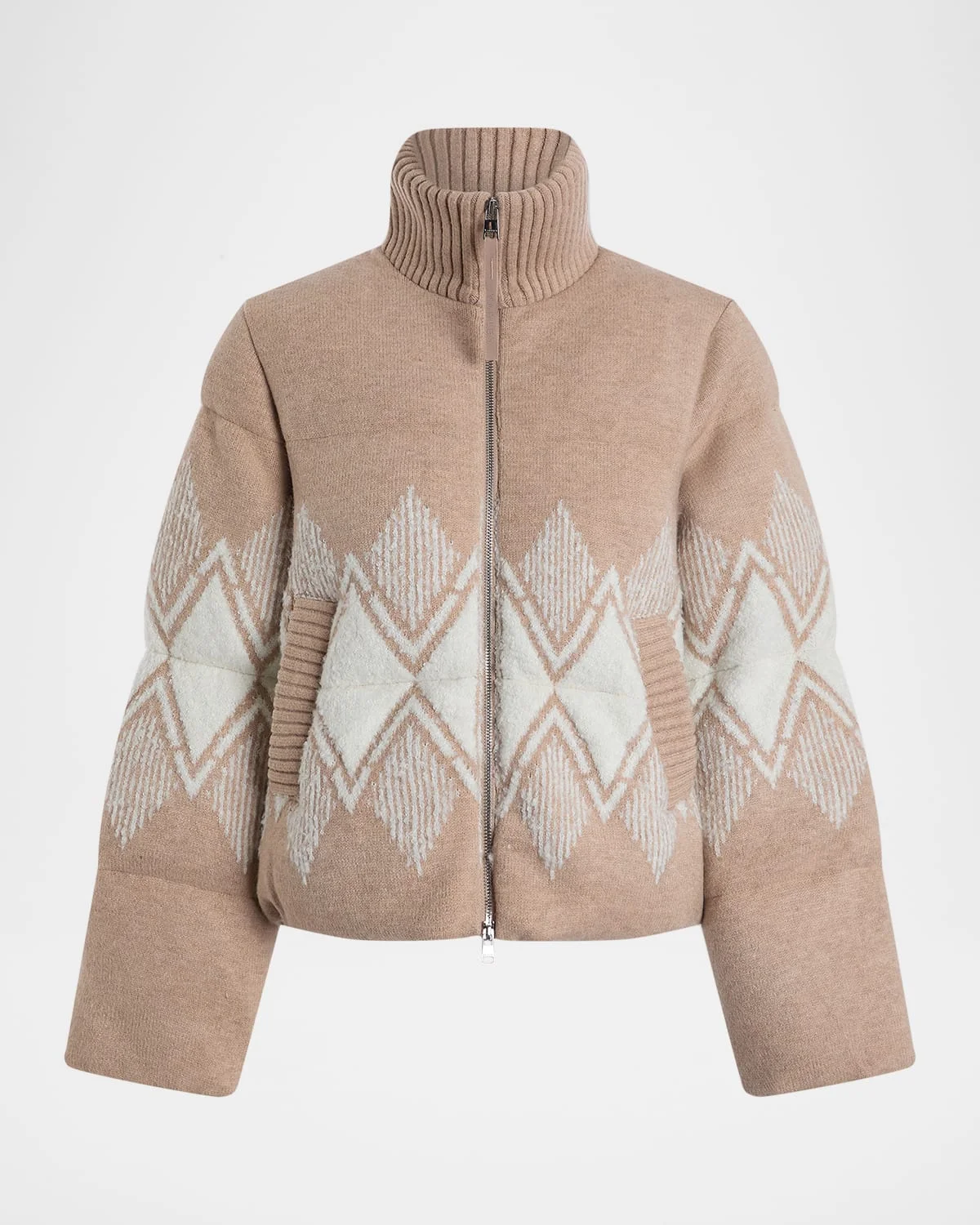 Varley's "Belinda" puffer jacket offers a modern alpine design with boucle yarn in a diamond jacquard pattern Approx. 23.6"L from shoulder to hem High knitted neckline; twoway zip front Long sleeves with thumbhole cuffs; approx. 24"L Knitted welt pockets Classic fit Hip length Acrylic/pbt/nylon/polyamide Fill: Sorona® Dry clean Imported