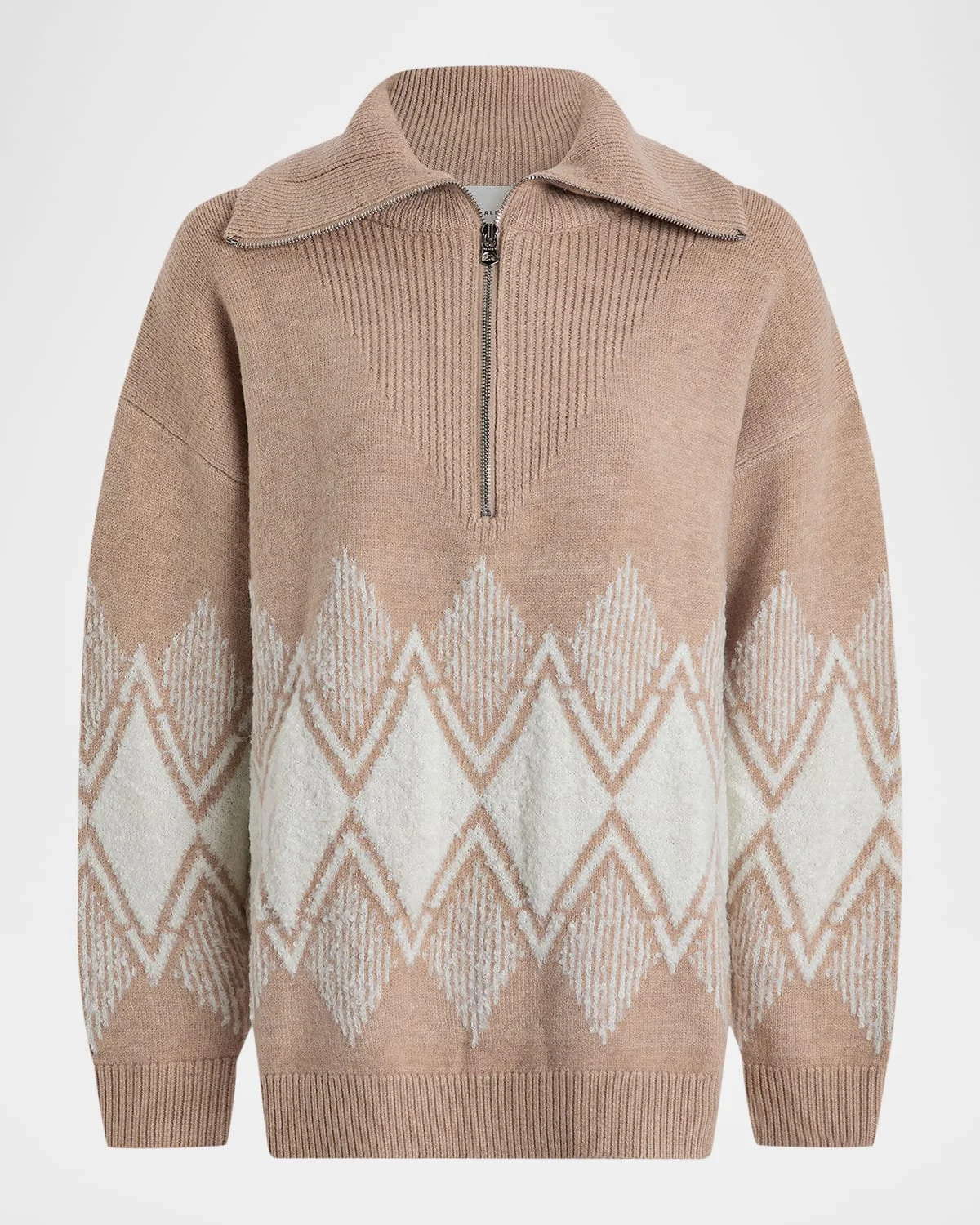 Varley's "Betty" sweater is knit with a contrasting diamond jacquard design along the hem and sleeves Approx. 26"L from shoulder to hem Oversized collar; partial zip front Dropped shoulders Long sleeves; approx. 19.7"L Relaxed fit Hip length Pullover style Acrylic/polyester/nylon/polyamide Dry clean Imported