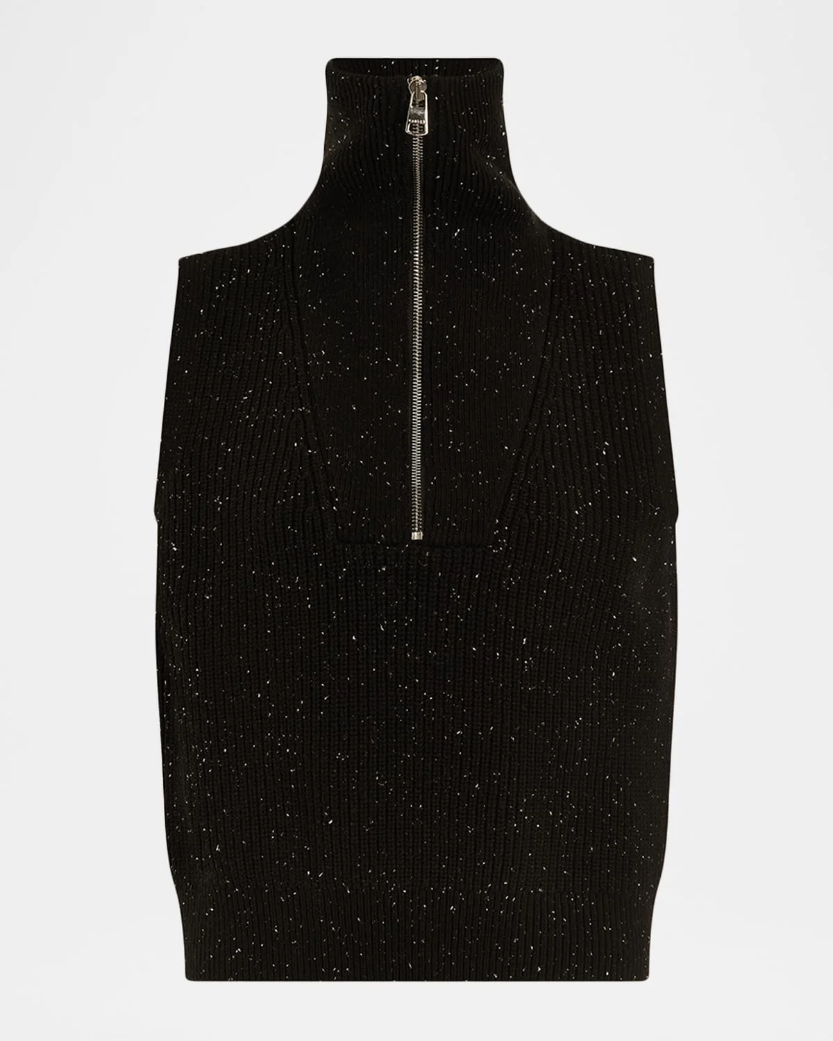An easy layering piece, Varley's "Hally" vest is knit from pure cotton in a fleck yarn design and finished with ribbed texture Approx. 20.1"L from shoulder to hem Oversized collar; halfzip front Sleeveless Relaxed fit Hip length Pullover style Cotton Machine wash cold Imported