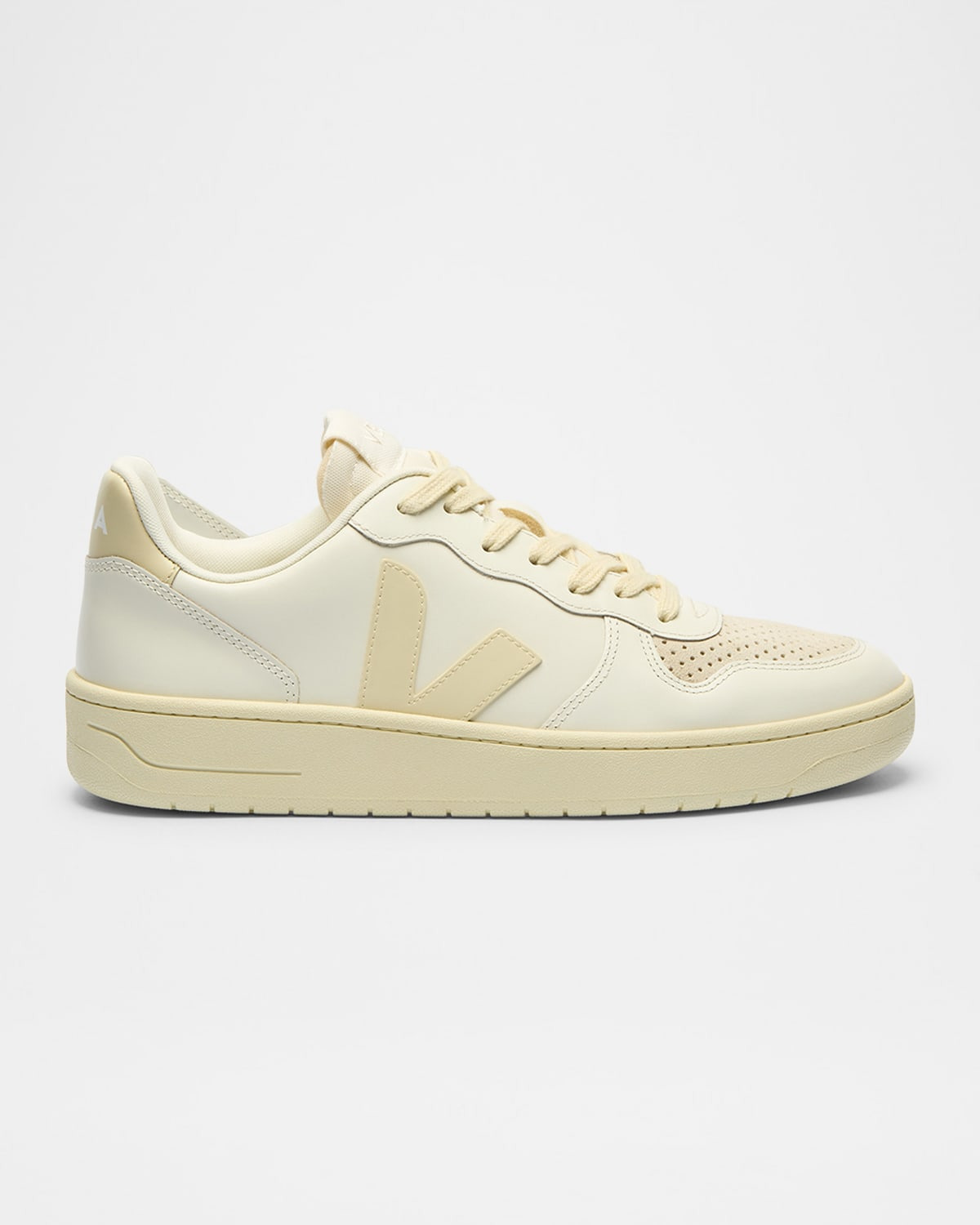 - VEJA "V-10" bicolor low-top leather and suede sneakers - Contrast logo and back collar. - Flat heel - Round toe - Lace-up vamp - Cushioned footbed - Rubber outsole - Lining: Recycled polyester - Made in Brazil