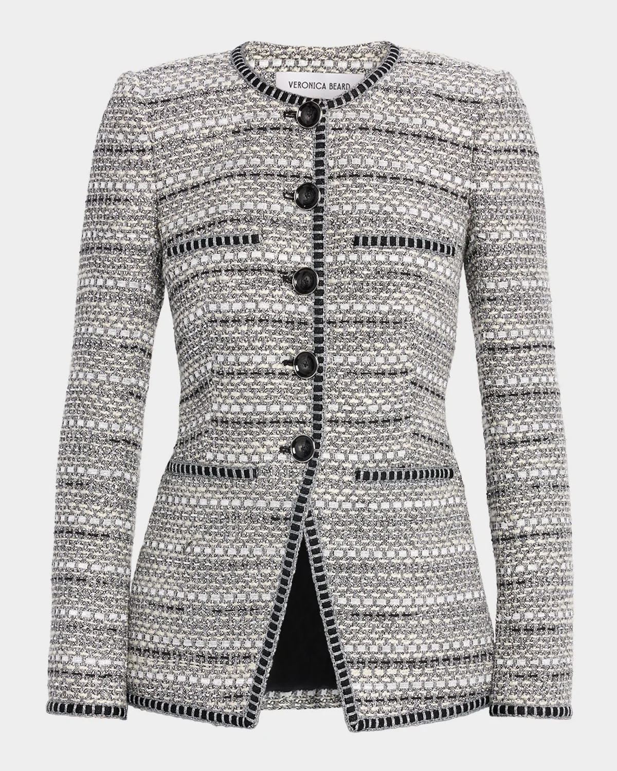 Crafted from tweed, the "Alessia" jacket by Veronica Beard boasts contrast whipstitching and polished buttons for a seamless, tailored silhouette. Crew neckline Singlebreasted front Long sleeve; approx. 32.3"L Faux chest and hip welt pockets Tailored fit Cutaway hem Buttonfront Cotton/polyester/acrylic Lining: Polyester Dry clean Imported