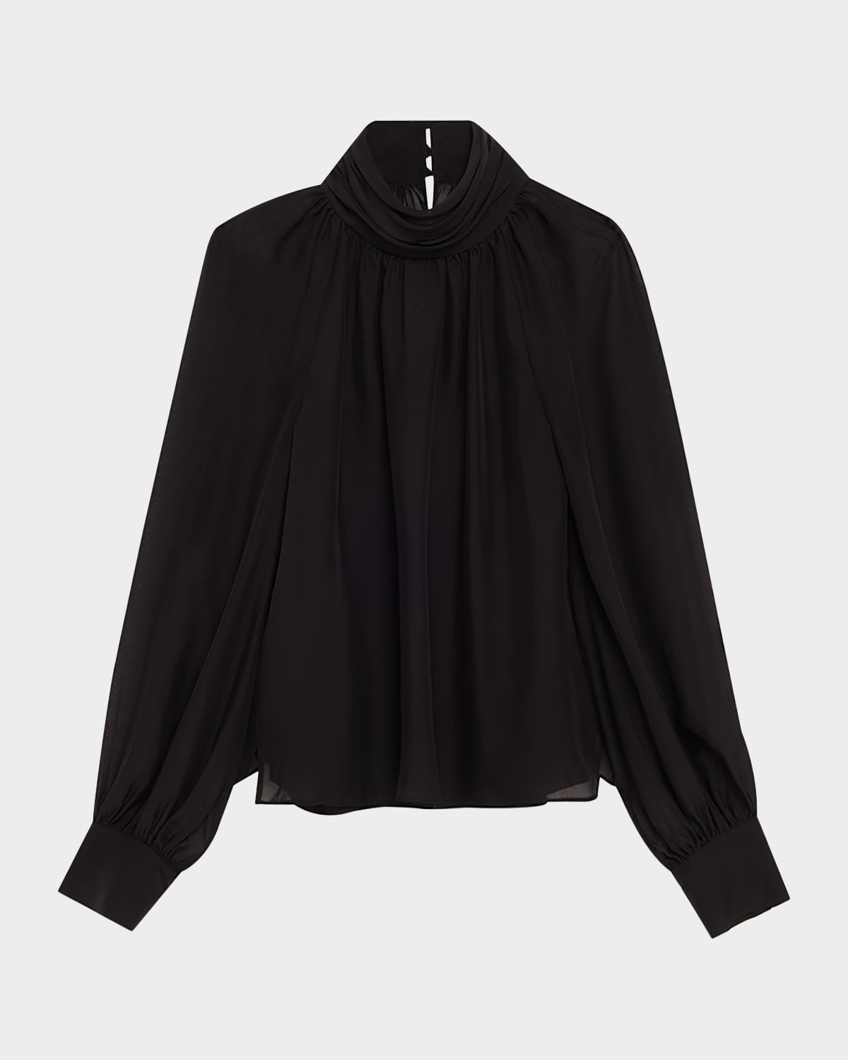 Detailed with soft gathering, the "Alyssa" blouse by Veronica Beard is cut from sheer silk chiffon for a feminine, fluid drape Approx. 23.3"L from shoulder to hem High ruched neckline; buttons behind the neck Long blouson sleeves with button cuffs; approx. 31.5"L Relaxed fit Hip length Slipover style Silk Lining: Polyester Dry clean Imported