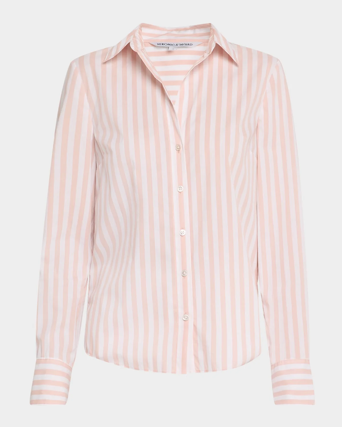 - Veronica Beard "Amelia" crisp cotton poplin shirt featuring a stripe motif - Point collar - Long sleeves with button cuffs - Classic fit - Hem falls to the hip - Button-front - Cotton/polyamide/spandex - Dry clean - Imported