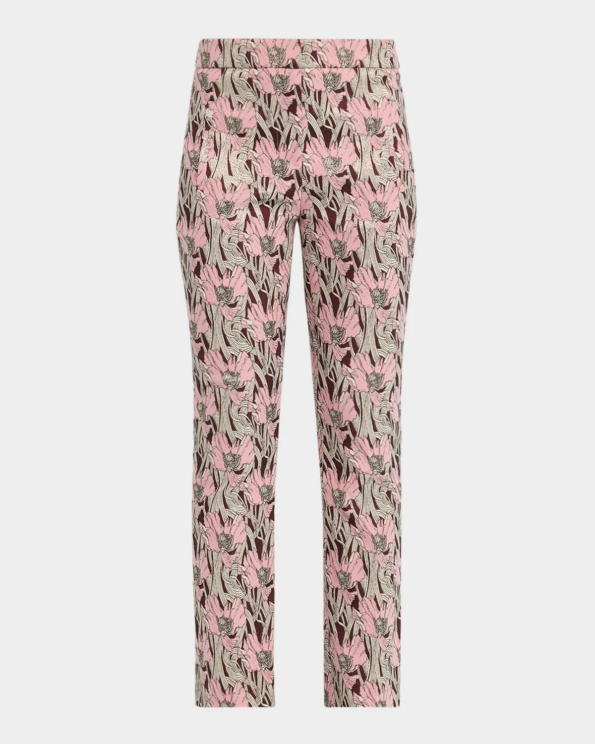 Veronica Beard's "Arte" slim pants are detailed with an intricate floral pattern and metallic threads woven throughout. High rise Fourpocket style Straight legs Ankle length with a subtle flare Hook/zip fly Polyester/viscose/metallic fibers Dry clean Made in USA
