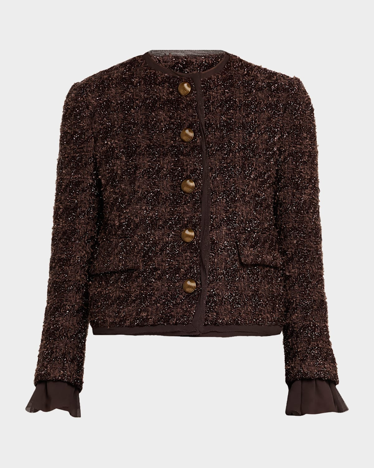Finished with sparkling metallic flecks, the "Audrina" jacket by Veronica Beard is crafted in textural tweed with golden embosseddome buttons and tonal chiffon trim. Approx. 20.4"L from shoulder to hem Collarless neckline; buttonfront Long sleeves with button cuffs; approx. 29.5"L Hip welt pockets Classic fit Hip length Polyamide/acrylic Lining: Cupro Dry clean Imported