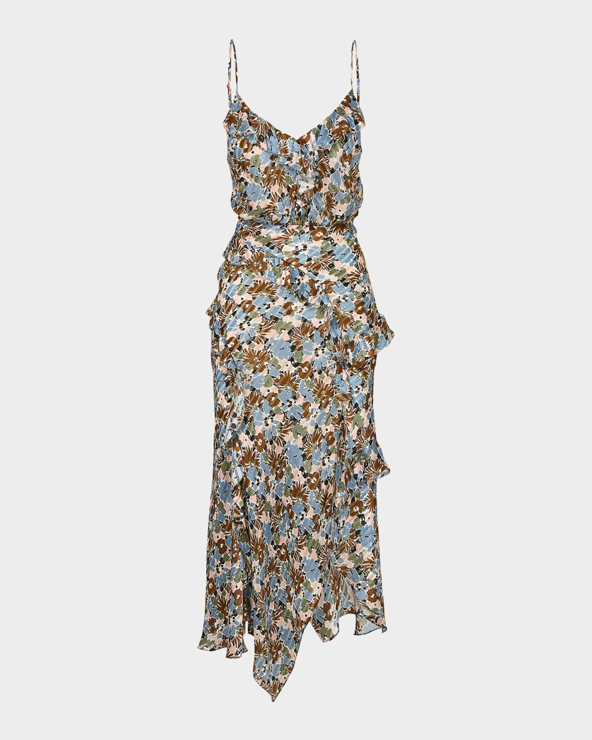 - Veronica Beard "Avenel" floral-print silk midi dress enhanced with cascading ruffles - V neckline - Adjustable spaghetti straps - Slip silhouette - Thigh-high slit - High-low hem - Side zip - Silk - Dry clean - Imported