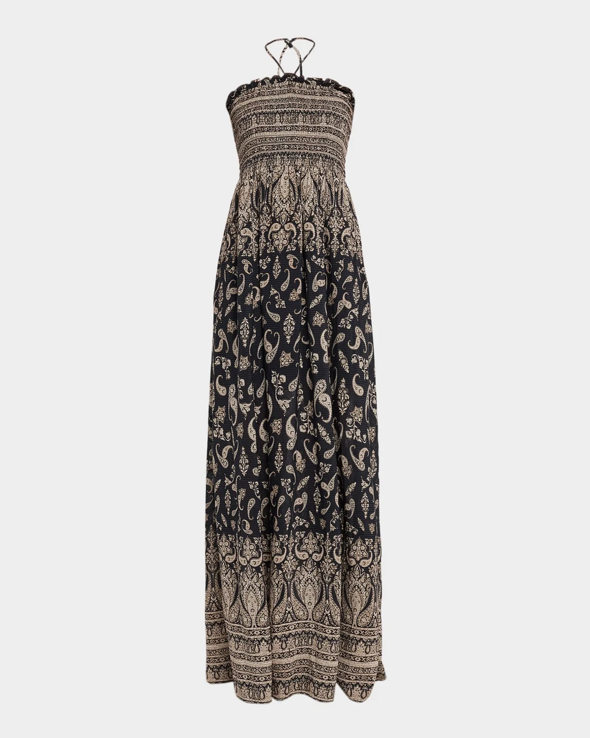 Crafted from a breathable cotton blend, the "Ayanna" maxi dress by Veronica Beard boasts an intricate paisley print and a smocked bodice for comfort. Selftie halter neckline with beading Sleeveless Side seam pockets Aline silhouette Full length Slipover style Viscose/cotton Lining: Cotton Dry clean Imported