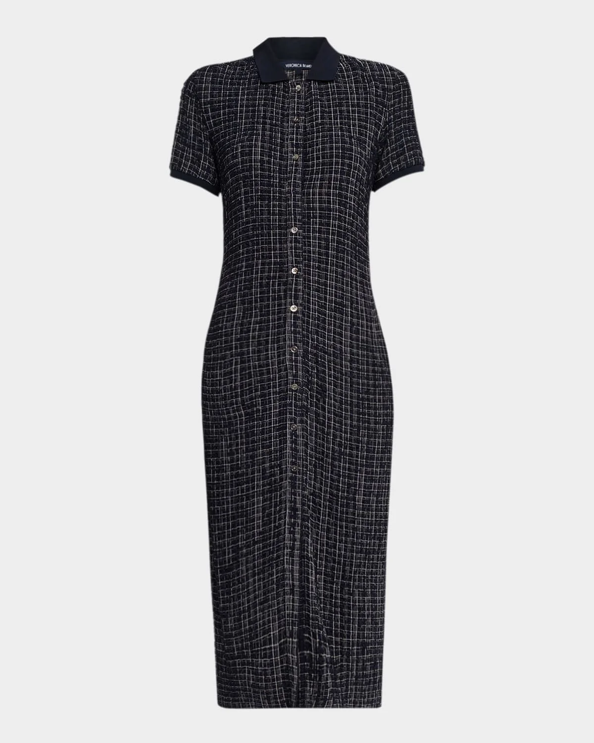 Crafted from a premium stretch blend, the "Barrett" dress by Veronica Beard boasts a textured plaid motif finished with solid trim for a chic shirtdress silhouette. Spread collar; buttonfront Short sleeves; approx. 32"L Slim fit Hem falls below the knee Viscose/polyester/elastane Dry clean Imported