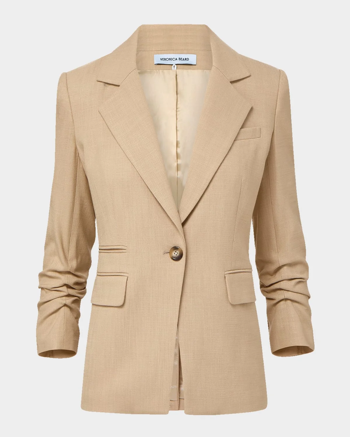 Veronica Beard "Battista" dickey jacket finished with a single-breasted front & nbsp; Compatible with Veronica Beard dickey & apos;s (sold separately) Notch lapels & nbsp; Ruched sleeves with button cuffs Welt and flap pockets Tailored fit Cut-away hem & nbsp; Back vent Button-front & nbsp; Viscose/elastane Dry clean Made in USA
