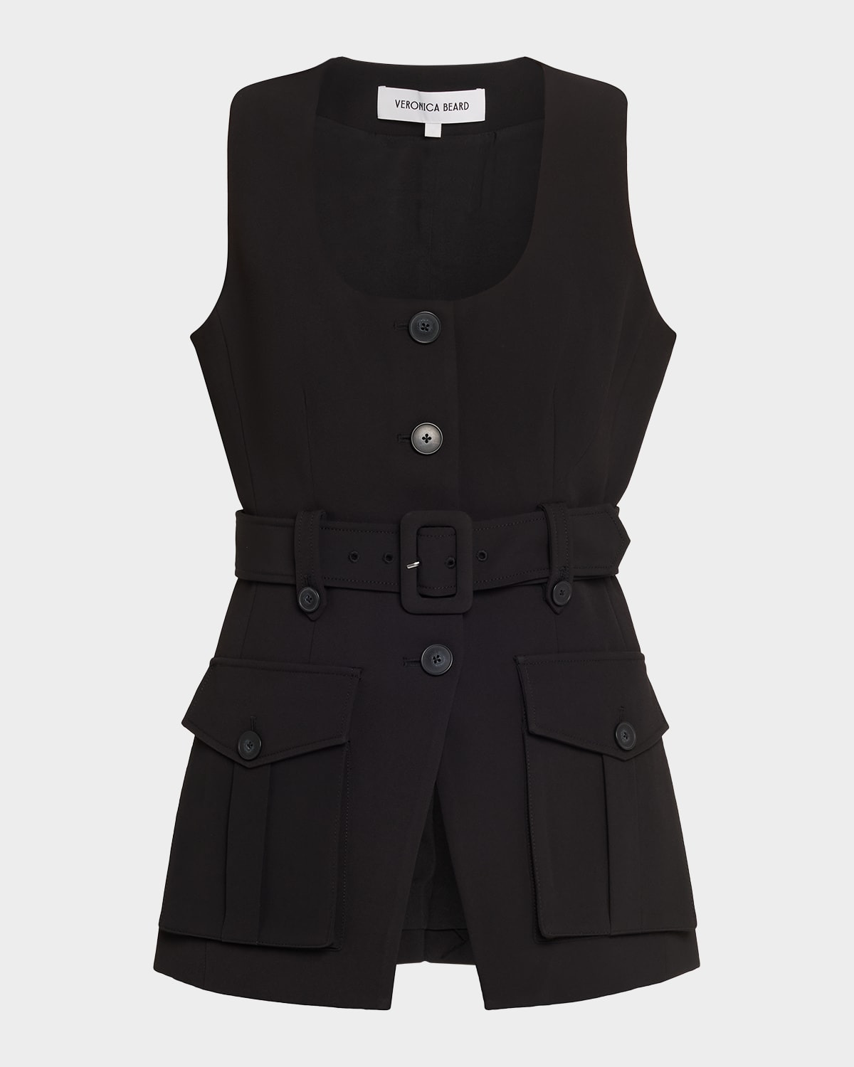 Utilityinspired vest by Veronica Beard. Scoop neckline Sleeveless Adjustable belt Hip flap pockets Tailored fit Cutaway hem Buttonfront Polyester/elastane Lining: Polyester Dry clean Imported