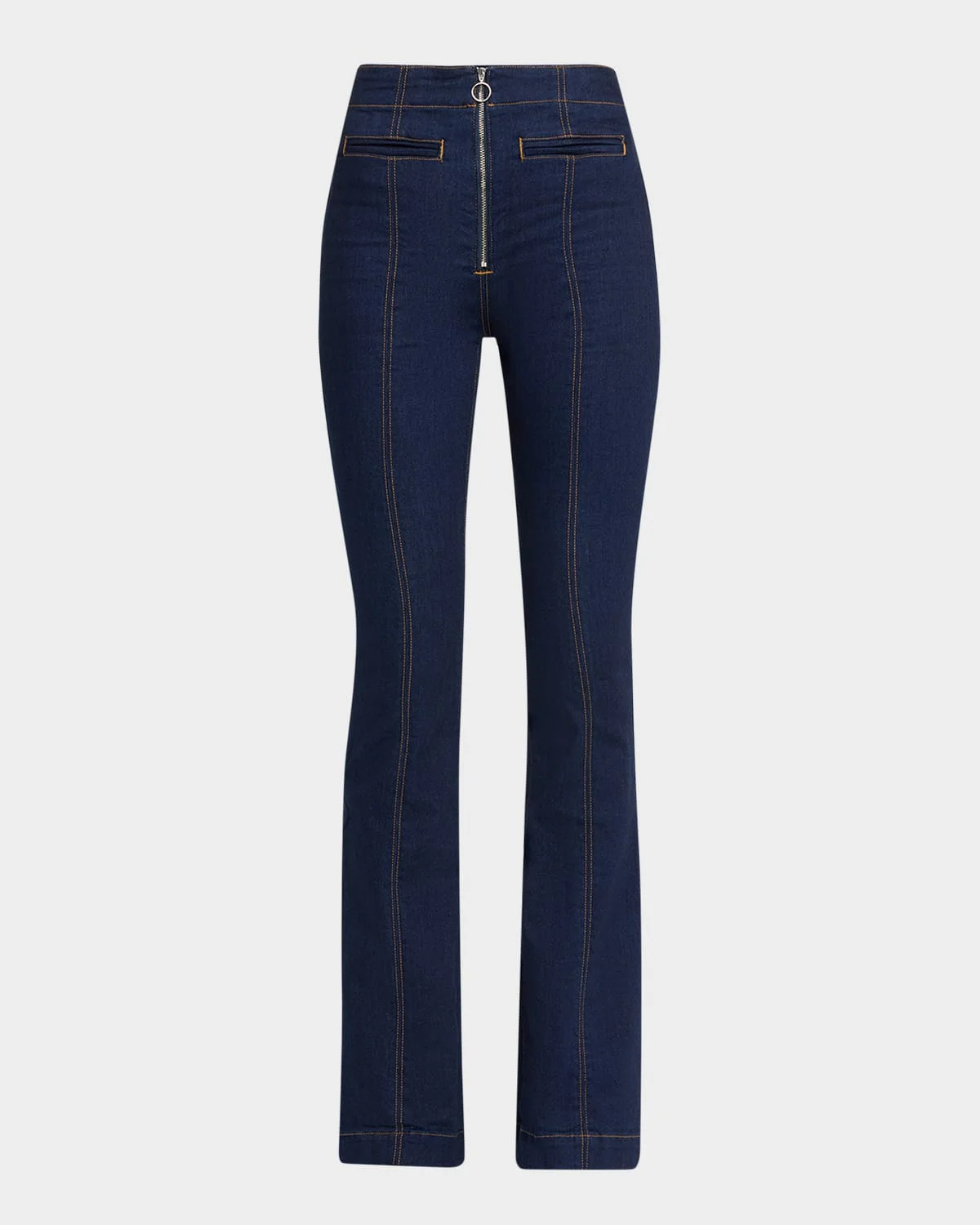 Veronica Beard "Beverly" skinnyflare jeans adorned with contrast topstitching in comfortstretch denim Approx. 11.5" rise; 35" inseam High rise Front welt pockets Slim fit Full length Exposed zipfly Cotton/elastane Machine wash cold Made in Italy
