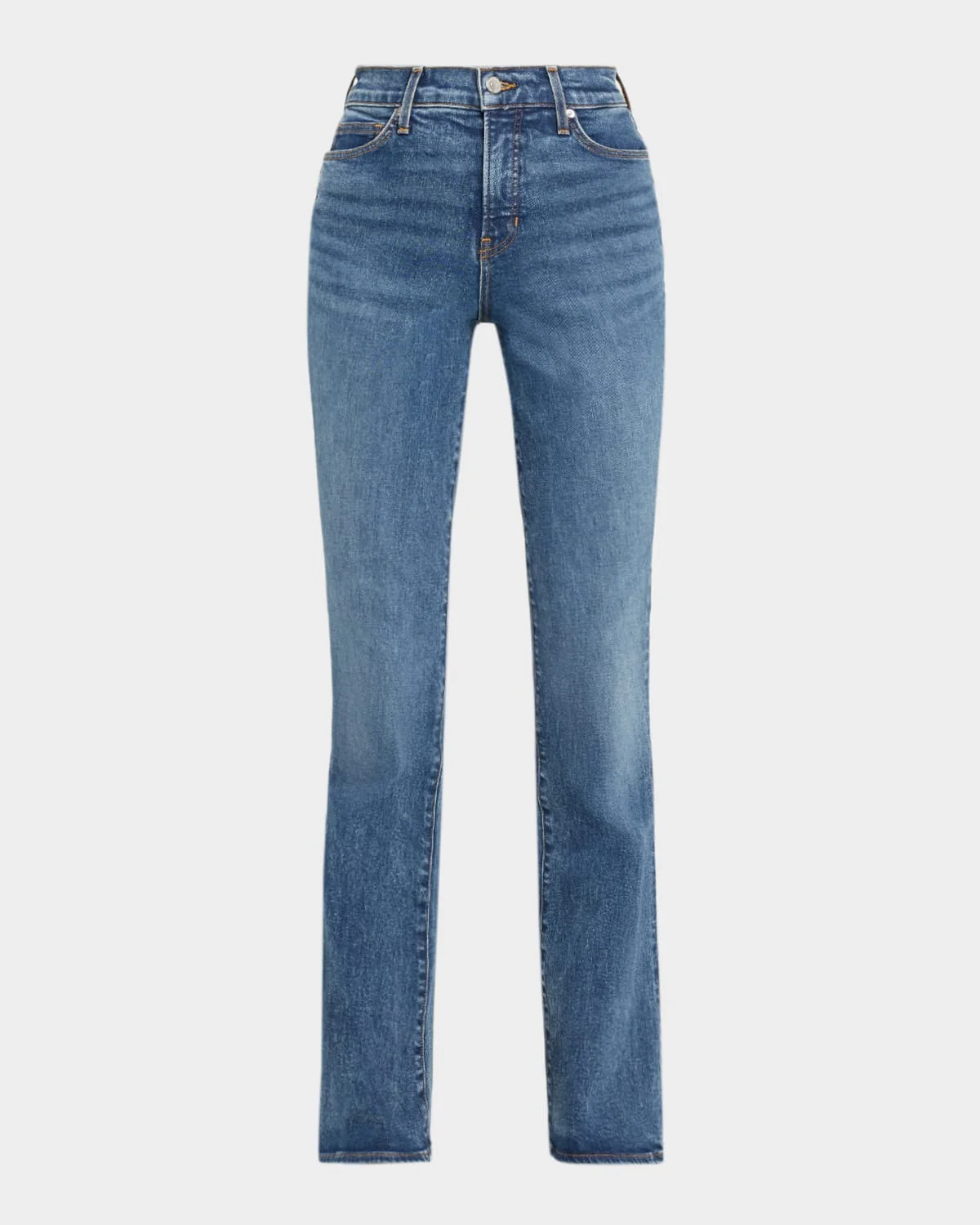 Veronica Beard "Beverly" skinny flare jeans in mediumwash stretch denim Approx. 11" rise; 34" inseam High rise Fivepocket style Fitted through the hip and thigh Full length Button/zip fly; belt loops Cotton/elastane Machine wash cold, inside out Made in USA