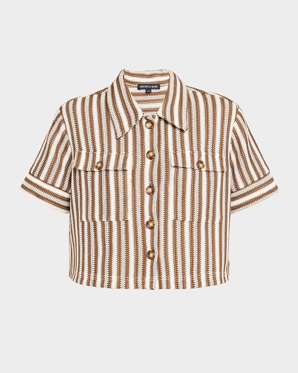 - Veronica Beard "Bouvier" textured stripe top - Point collar - Short sleeves; approx. 17"L - Dual chest pockets - Boxy fit - Hem sits at the hip - Button-front - Polyester - Machine wash cold - Imported