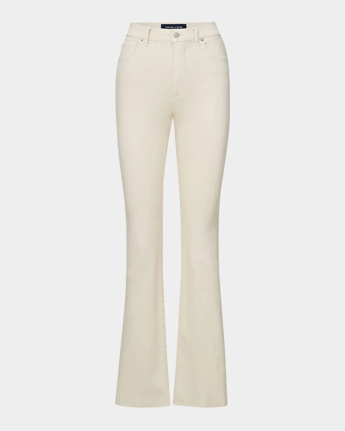 - Veronica Beard "Cameron" bootcut jeans featuring a raw hem in crisp white super-stretch denim - Approx. 11" rise; 32" inseam - Mid-rise; sits high on the hip - Five-pocket style - Easy fit - Full length - Button/zip fly; belt loops - Cotton/polyester/polyurethane - Machine wash cold, hang dry - Made in USA from imported materials