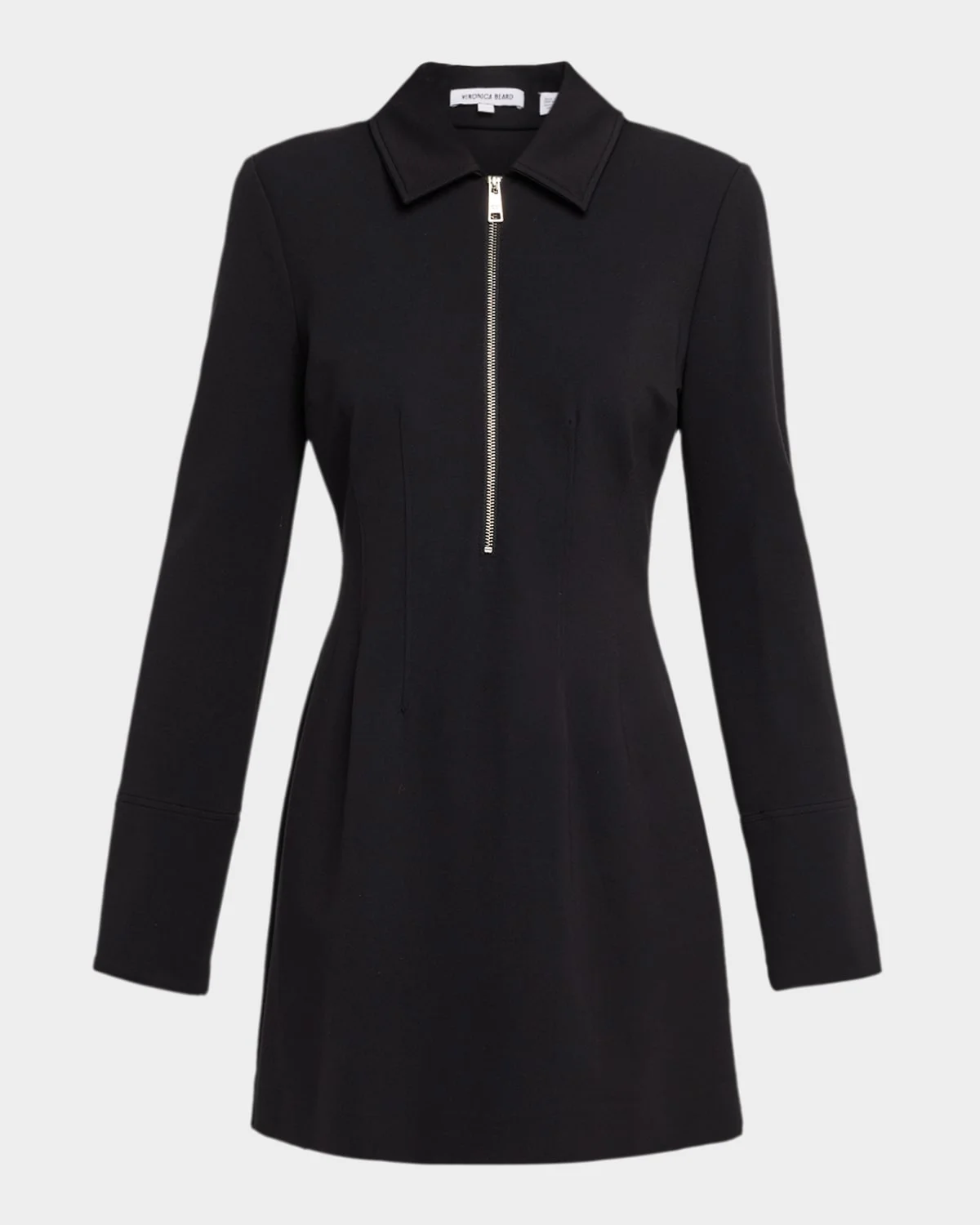 Crafted from a stretch blend, the "Capelle" mini dress by Veronica Beard boasts a sporty, Aline silhouette that can be dressed up or down. Point collar; half zipfront Long sleeves with wide cuffs; approx. 32.3"L Hem falls above the knee Slipover style Viscose/nylon/polyamide/elastane Lining: Polyester Dry clean Made in USA from imported materials