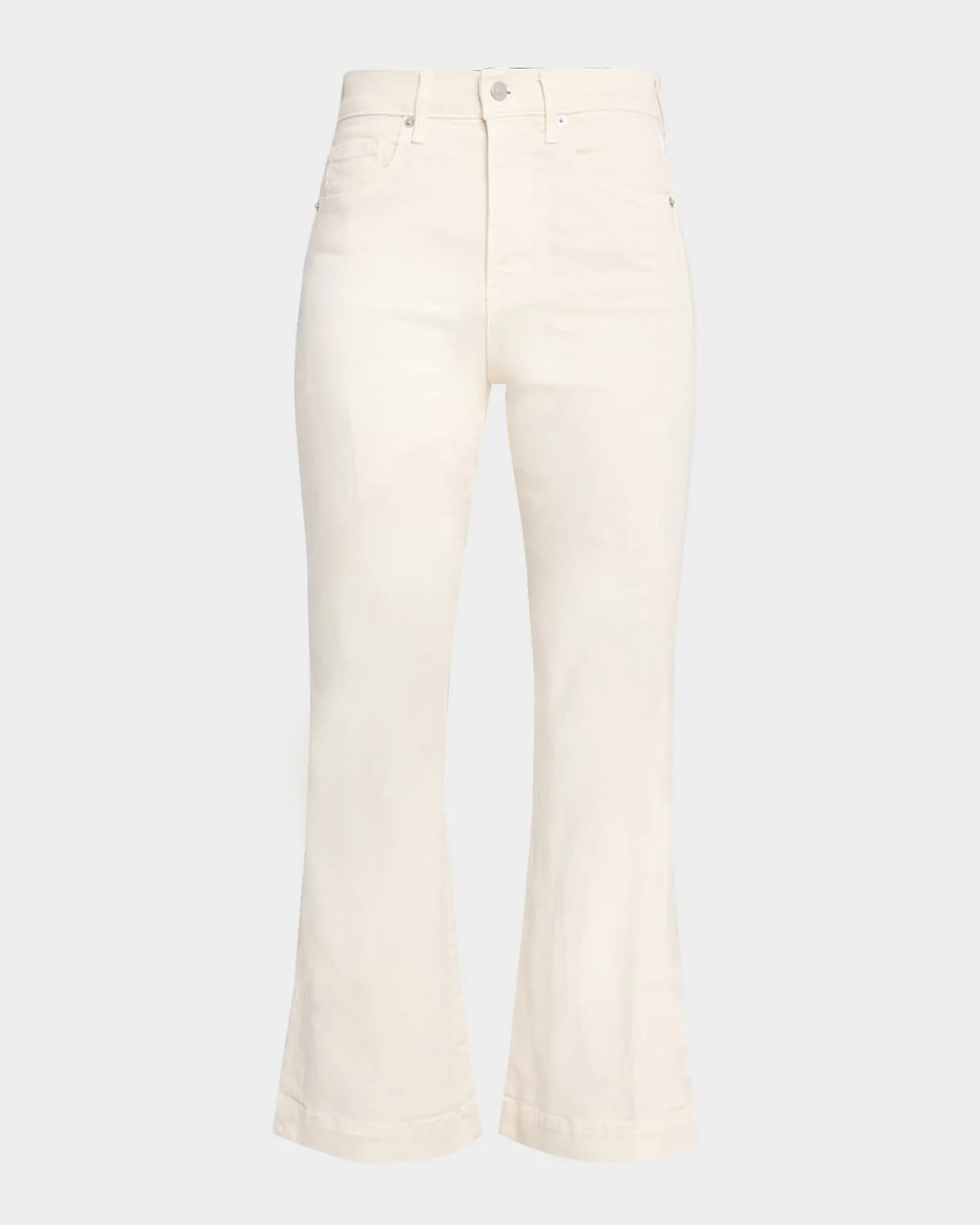 Veronica Beard Jeans "Carson" flared jeans in crisp white denim Approx. 11.5" rise; 28" inseam High rise Fivepocket style Fitted through the hip and thigh Ankle length Button/zip fly; belt loops Cotton/polyester/polyurethane Machine wash cold Made in USA