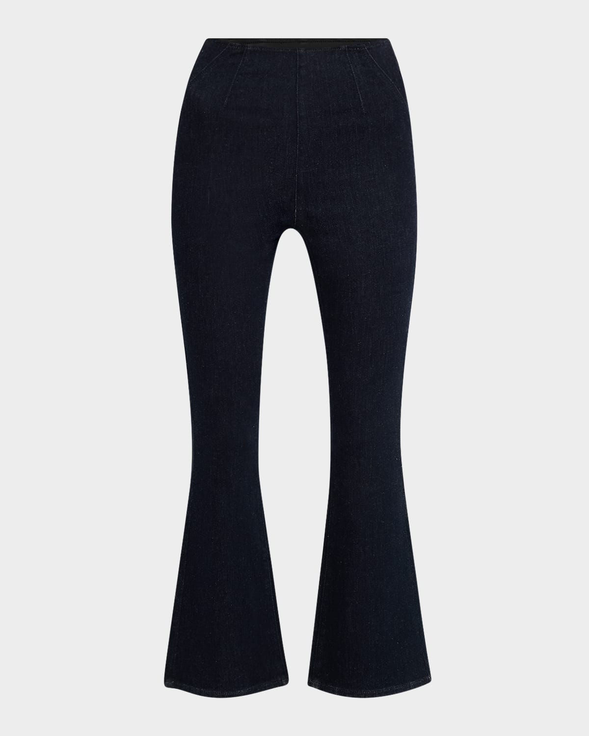 Veronica Beard "Carson OffDuty" kickflare jeans in darkwash stretchdenim Approx. 11" rise; 27" inseam High rise Elastic waistband Fitted through the hip and thigh Cropped length Pullon style Cotton/polyester/elastane Unlined Wash inside out Imported
