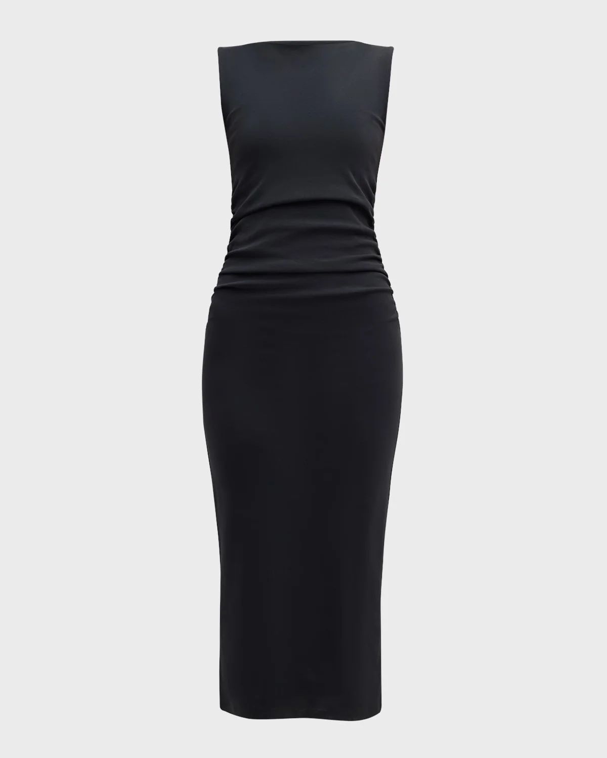 Veronica Beard "Charissa" knit midi dress with gathering at the sides High neckline Sleeveless Bodycon fit Hem falls below the knee Slipover style Cotton/elastane Unlined Wash inside out Imported