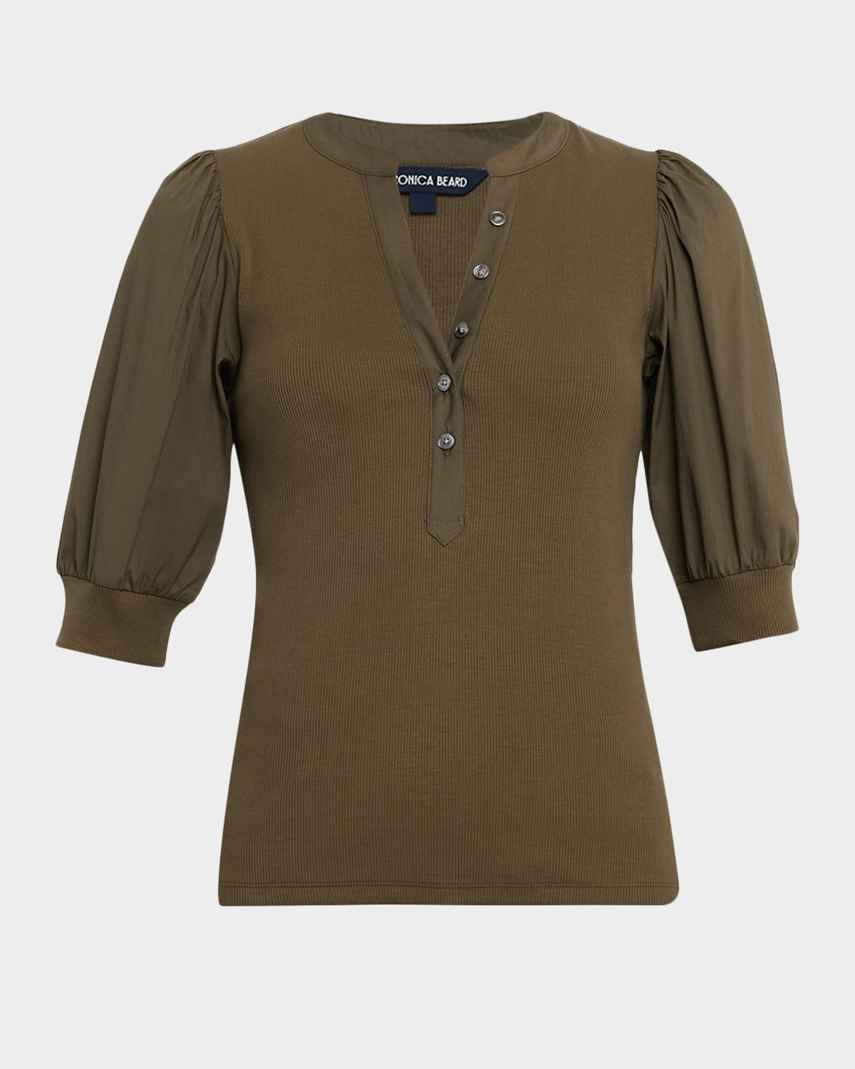 - Veronica Beard Jeans "Coralee" knit top featuring short puffed sleeves - V neckline - Easy fit - Hem sits at the hip - Half button-front - Cotton/elastane - Machine wash cold - Imported