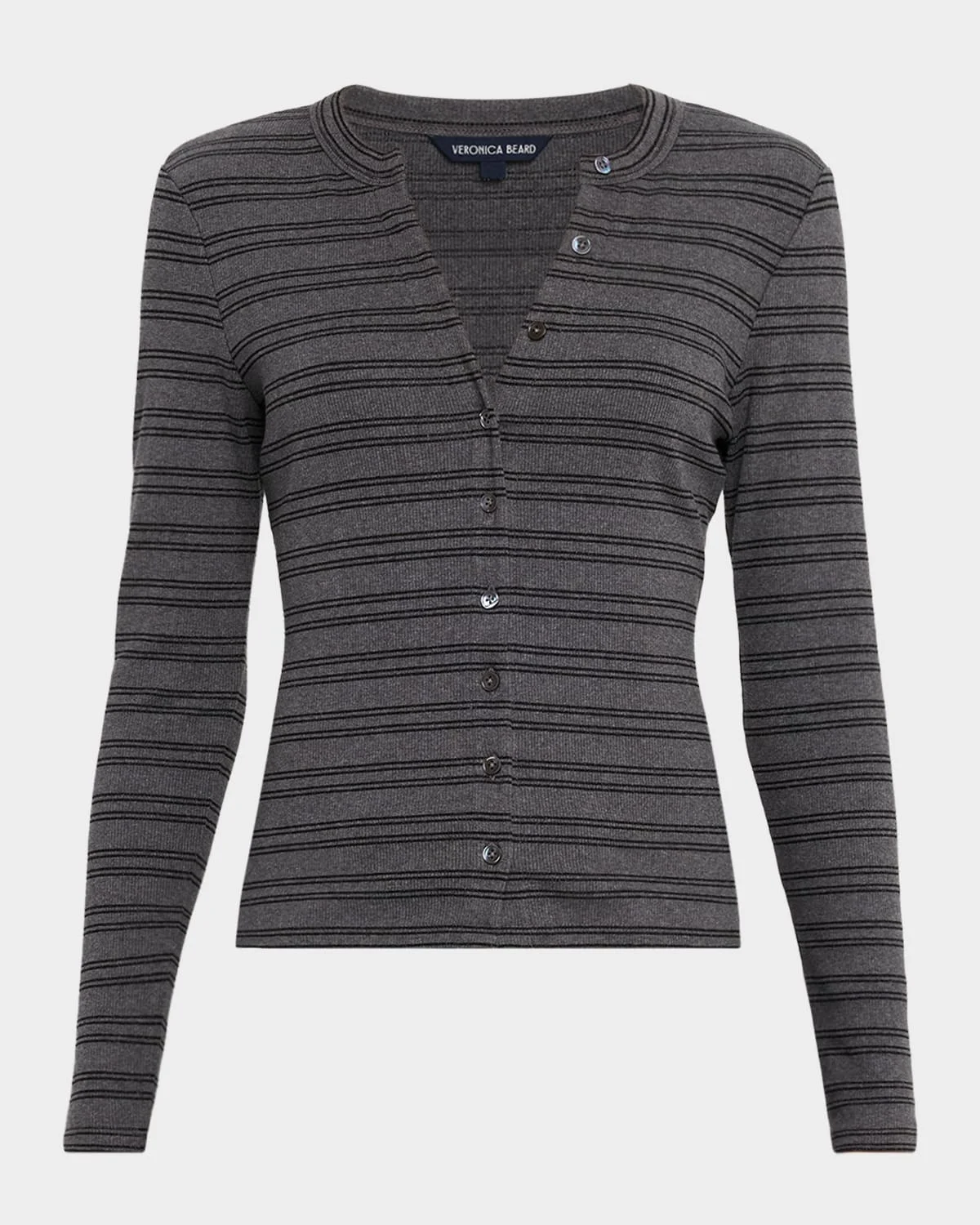 Veronica Beard "Dili" striped cardigan crafted in a fine ribbedknit Henley neckline Long sleeves Classic fit Hem sits at the hip Buttonfront Cotton/metallic fibers/elastane Machine wash cold Imported