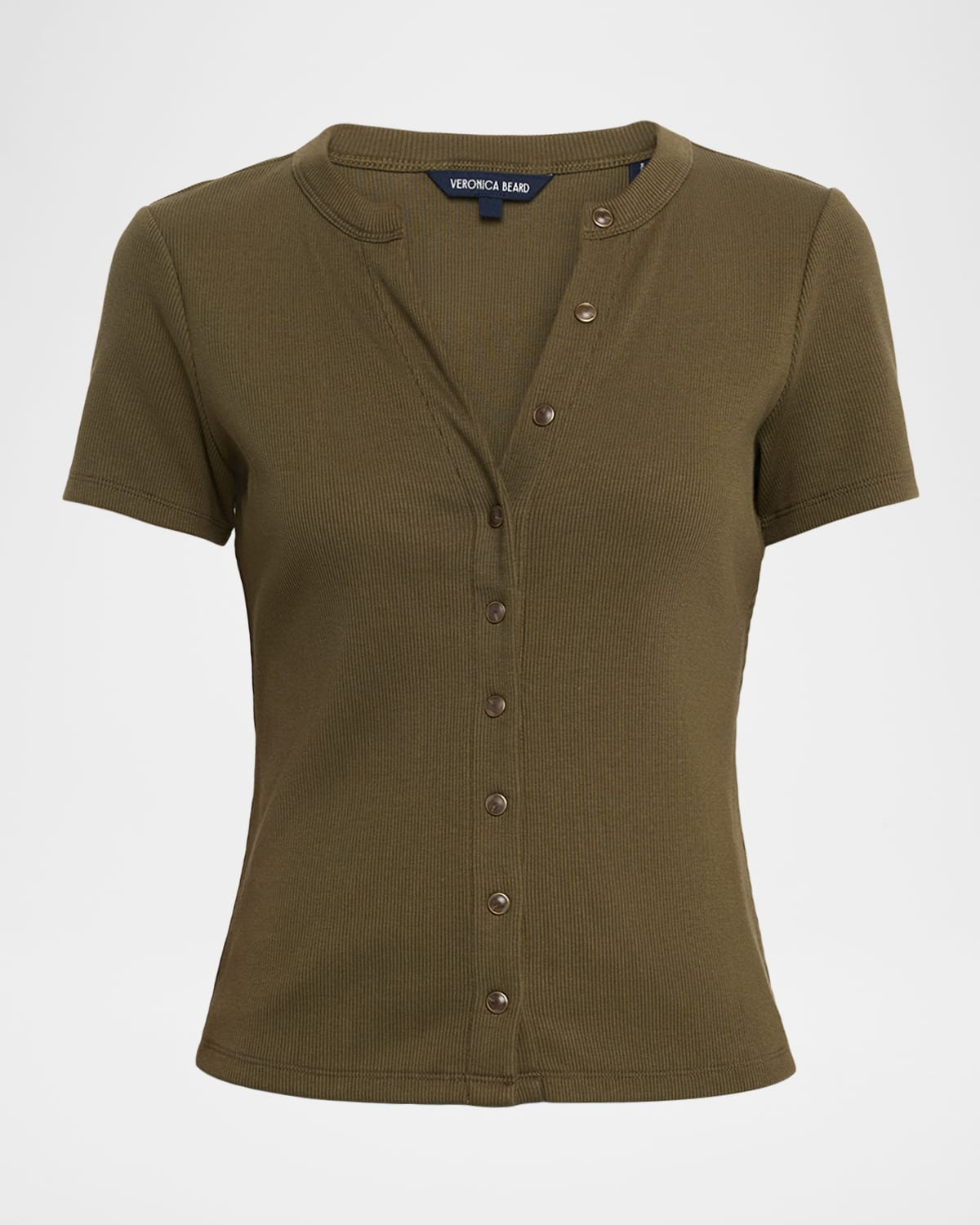 - An elevated basic, the "Dilia" top by Veronica Beard is cut from premium stretch cotton in a ribbed finish with bezel-set buttons - Split crew neckline - Short sleeves - Slim fit - Hip length - Button front closure - Cotton/elastane - Imported