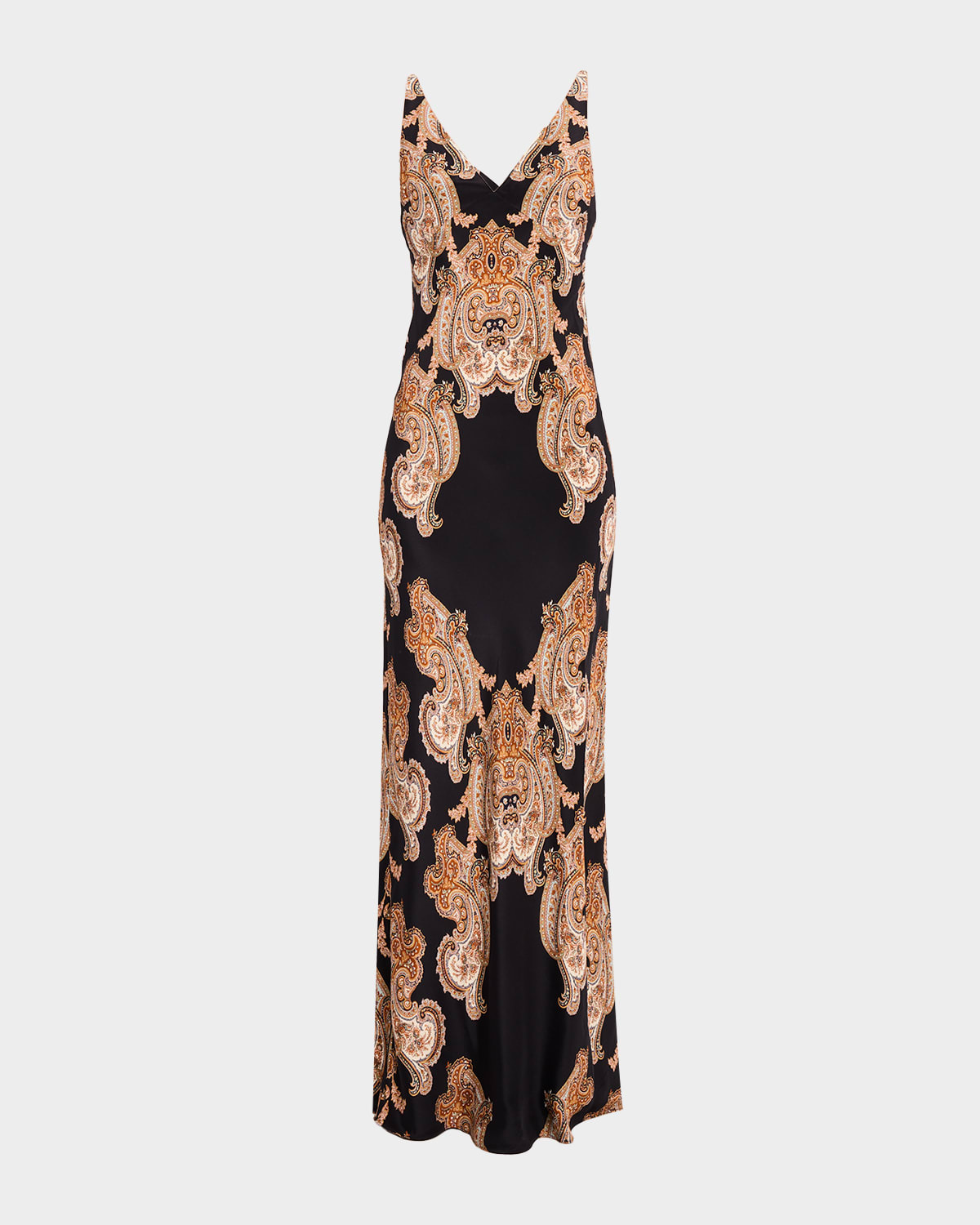 - The "Donelle" dress, crafted from luxurious silk by Veronica Beard, is adorned with an intricate paisley print and boasts a simple yet elegant silhouette. - V neckline - Adjustable spaghetti straps - Slip silhouette - Full length - Slipover style - Silk/viscose - Lining: Polyester - Dry clean - Imported