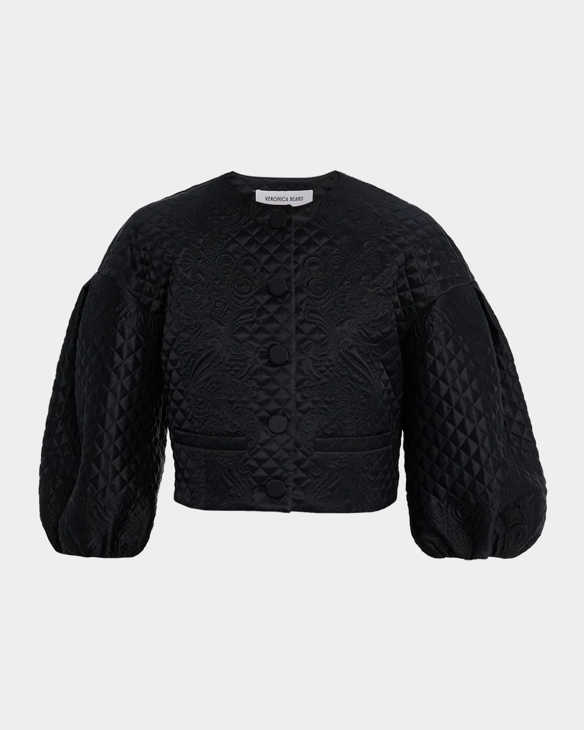 Framed with voluminous balloon sleeves, the "Drake" jacket by Veronica Beard is crafted from diamond and floralquilted lustrous tailoring fabric Approx. 19.3"L from shoulder to hem Collarless neckline; button front 3/4 sleeves with elastic cuffs; approx. 27.5"L Front welt pockets Cropped hem Polyester Dry clean Imported