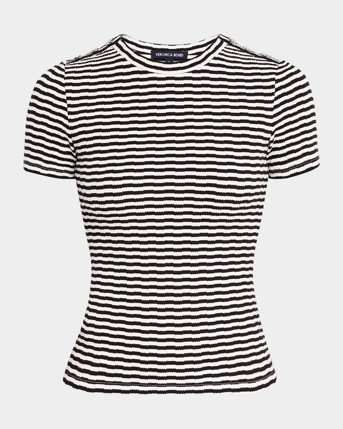 - Veronica Beard "Draya" ribbed tee featuring buttons at the shoulders - Crew neckline - Short sleeves; approx. 14.3"L - Easy fit - Hem sits at the hip - Pullover style - Cotton/polyester/elastane - Machine wash cold - Imported - Model is 5'10"/177cm.