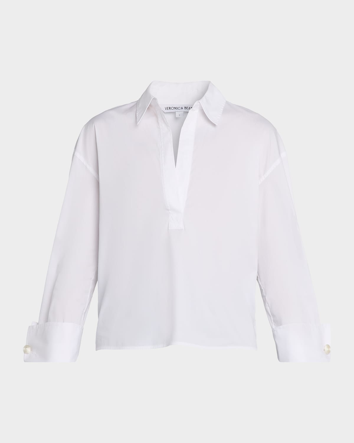 A modern take on classic shirting, the "Draymond" shirt by Veronica Beard is cut from stretch cotton with a split V neckline for an effortless finish. Spread collar Dropped shoulders Bracelet sleeves with button cuffs Relaxed fit Highlow hem Pullover style Cotton/polyester/elastane Dry clean only Imported