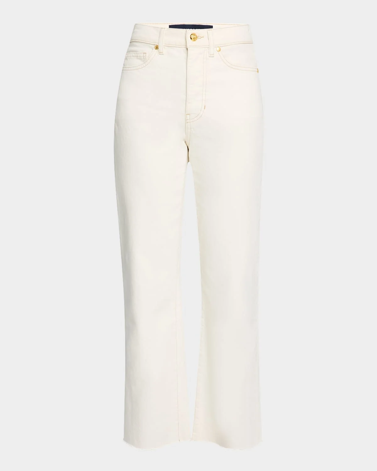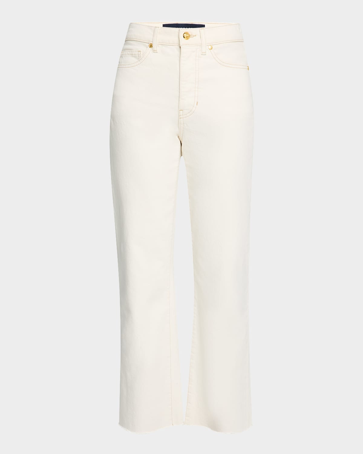 Veronica Beard "Dylan" jeans featuring a raw hem in white denim Approx. 11.5" rise; 27" inseam High rise Fivepocket style Straight legs Ankle length Button/zip fly; belt loops Cotton/elastane Machine wash cold Made in USA from imported materials