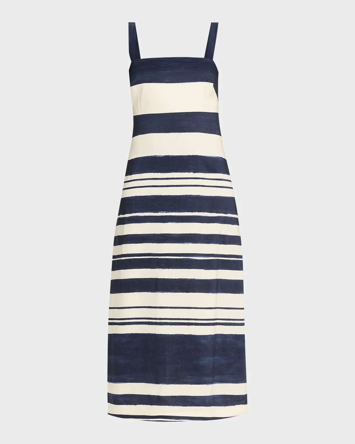 The "Ella" midi dress by Veronica Beard is cut from breathable linen and boasts a bold hand-painted stripe design. Square neckline Adjustable straps & nbsp; Slim, A-line silhouette Hem falls below the knee Center back zip & nbsp; Linen/viscose/elastane Lining: Cotton Dry clean only & nbsp; Imported SIZE & FITModel measurements: 5 & apos;10" tallModel is wearing a US size 4/Small